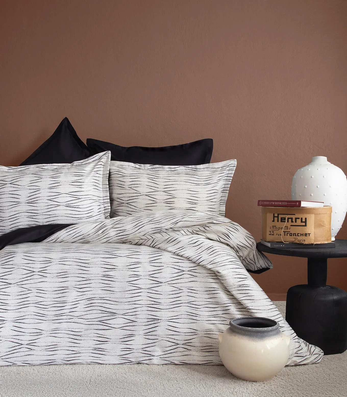 BEDRUKTE KATOENZIJD – 2 persoons beddengoed – 3 stuks: 1 dekbedovertrek 240×220 cm Knoopsluiting + 2 kussenslopen 63×63 cm met vlakke volants 3 cm. – Samenstelling 100% gekamd katoen 210 TC. (82 draden/cm2) Machinewasbaar op 60°C. OEKO–TEX gecertificeerd product: het Oeko–Tex® label garandeert dat gecertificeerde artikelen vrij zijn van schadelijke stoffen die schadelijk kunnen zijn voor de gezondheid.Dit beddengoed is ontworpen voor eindeloos comfort.De gebruikte vezel is gekamd katoen, wat het edelste deel van katoen is. De vezels zijn lang en zeer zacht.De weeftechniek van het satijnkatoen geeft het materiaal een stralende, zachte en zeer zijdeachtige uitstraling. De stof is elegant, duurzaam en zeer comfortabel. De kleuren zijn eigentijds, de lijn is puur en verfijnd, en de afwerkingen zijn minutieus.Voor een goede nachtrust, kiest u voor comfortabele en mooie lakens: uw welzijn is verzekerd….Om de glans van de kleuren te behouden, raden wij wasbeurten aan op 60 °.Als u kiest voor drogen in de droogtrommel, kies dan voor een gematigde temperatuur om de vezels te sparen.Uw beddengoed zal zachter worden na meerdere wasbeurten.