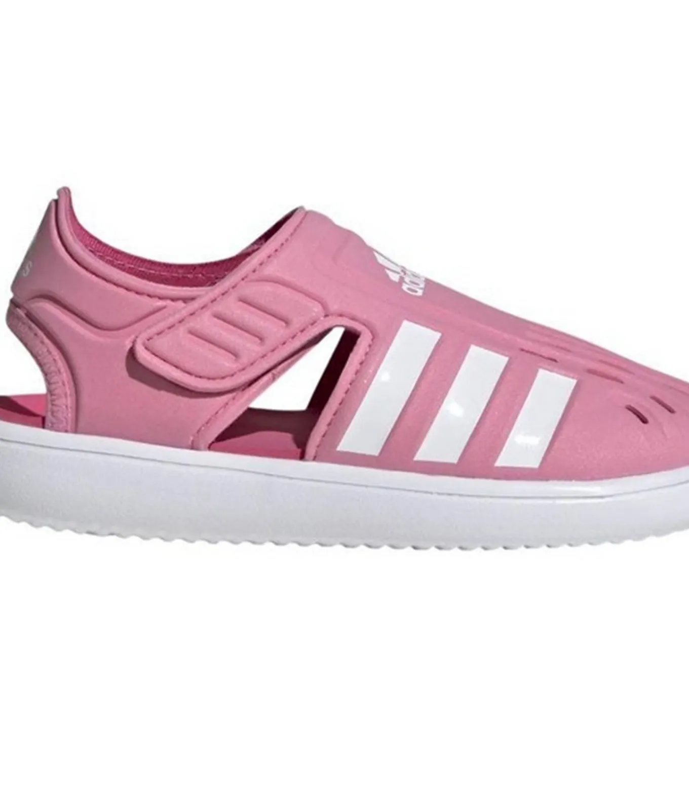 Adidas 3 STRIPES roze waterschoenen met EVA–schuim bovenkant en textiel voering, bevestigd met aanrakingsbevestigingsband. Deze schoenen hebben een synthetisch binnenzool, verstevigd tussenzool en rubber buitenzool met structuur. Ze beschikken over sneldrogende stoftechnologie, open hiel, perforatie en lage hak. Het ontwerp is van contraststreep, uitgesneden en met logo. De pasvorm is goed en het design is gesloten.