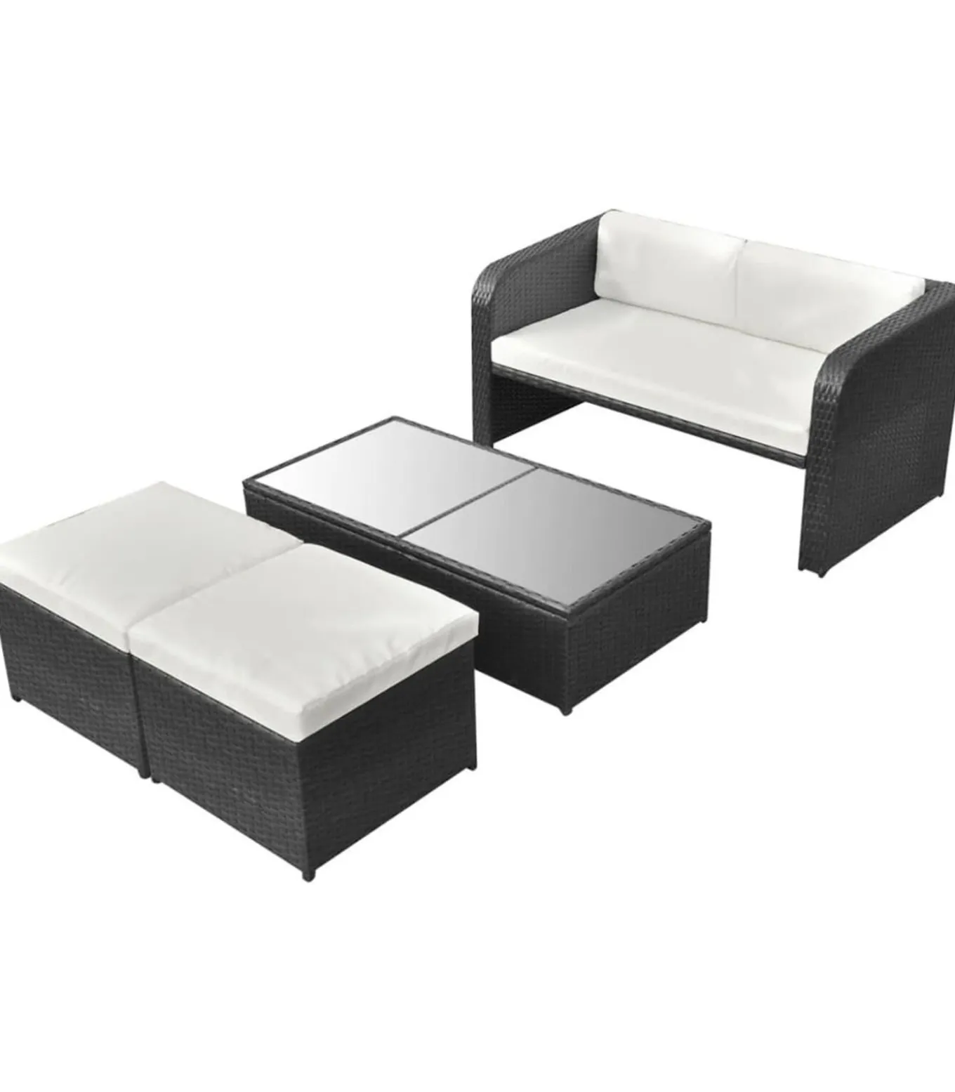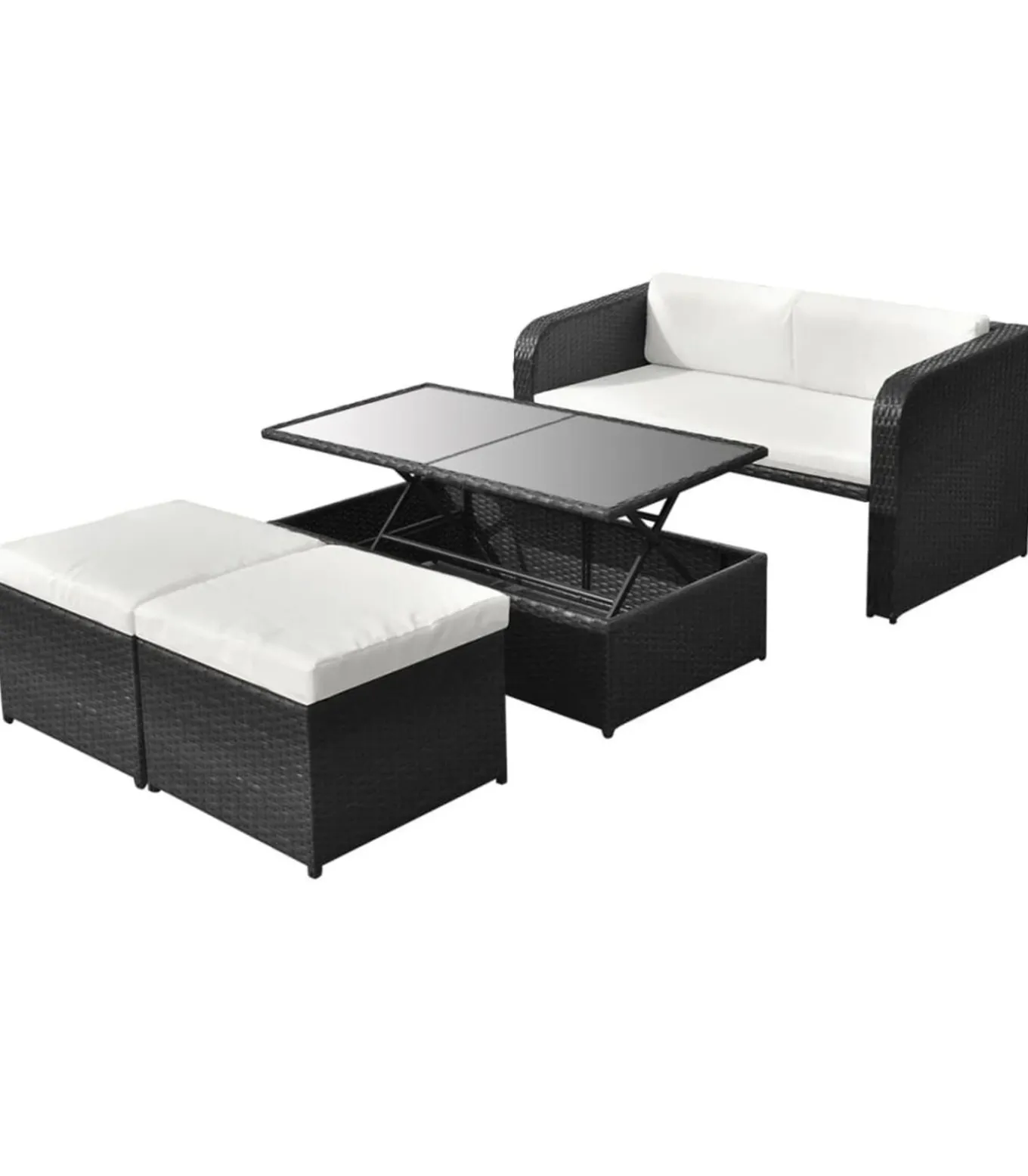 De set is gemaakt van stevig gepoedercoat staal en hoogwaardig PE ratten, dit maakt deze set enorm duurzaam. De dikke verwijderbare kussen zijn erg comfortabel. Het speciaal ontworpen uitvouwsysteem in de salontafel heeft een glazen tafelblad, dit maakt hem eenvoudig schoon te maken met een vochtige doek.