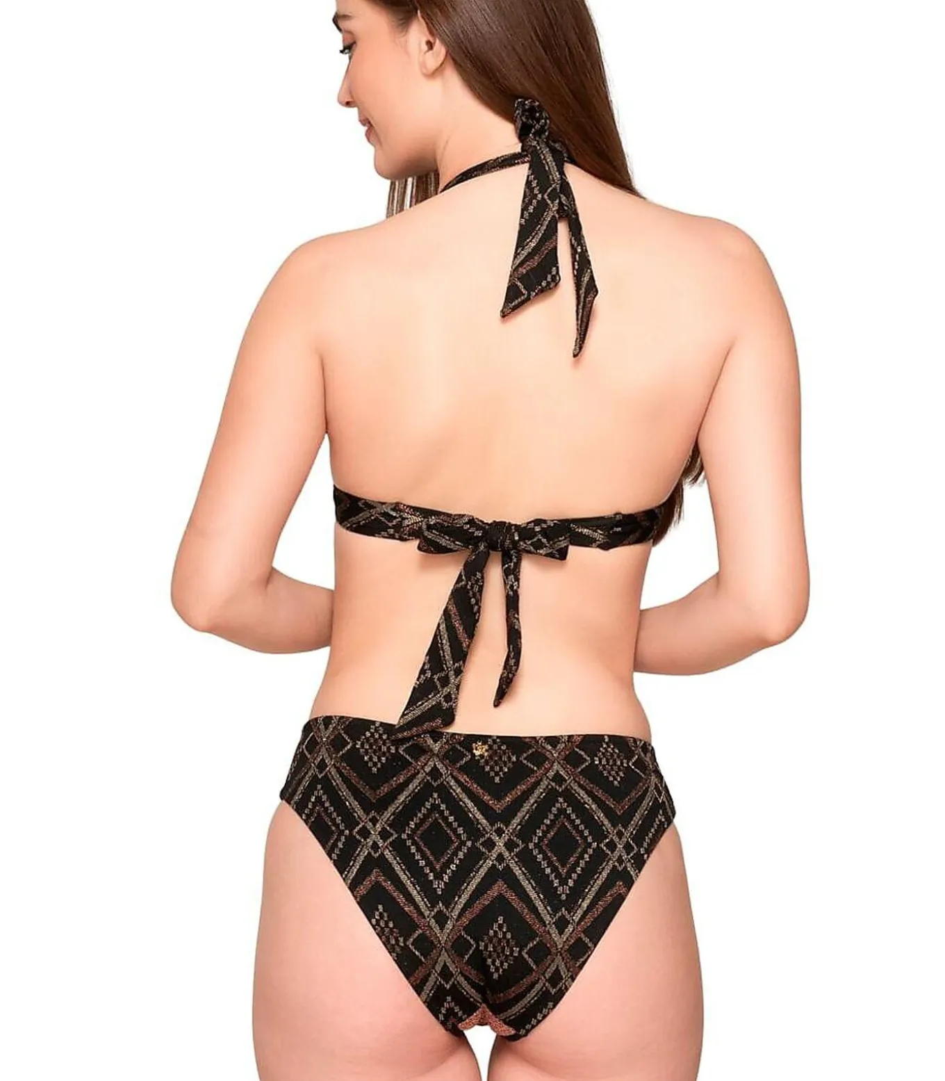 Elegant en modern klassiek gesneden zwembroekje met een chique en geraffineerde touch. De met lurex afgezette stof aan de voorkant en de geometrische versieringen in goud en koper op een zwarte achtergrond aan de achterkant voegen diepte en originaliteit toe. De hoge taille is licht ingesprongen bij de heupen, waardoor de benen optisch langer worden. Contrasterende zwarte boorden aan de voorkant, tailleband en rond de benen benadrukken de vorm en voegen een grafische touch toe. Het patroon van deze collectie combineert glanzende geometrische details in reliëf met lurex voor unieke, sprankelende zomerse looks. Deze harmonieuze mix creëert een speciaal, luxueus effect. Perfect voor wie op zoek is naar een glamoureuze, verfijnde look, op het strand of in het zwembad. Gemaakt van speciale microvezel voor extra comfort, sneldrogend, bescherming tegen de zon en met de meest geavanceerde textieltechnologie.[Zwemshortje afzonderlijk verkrijgbaar. Topje en zwembroekje worden apart verkocht. De top, sieraden en andere accessoires die het model op de foto’s draagt, zijn niet inbegrepen].