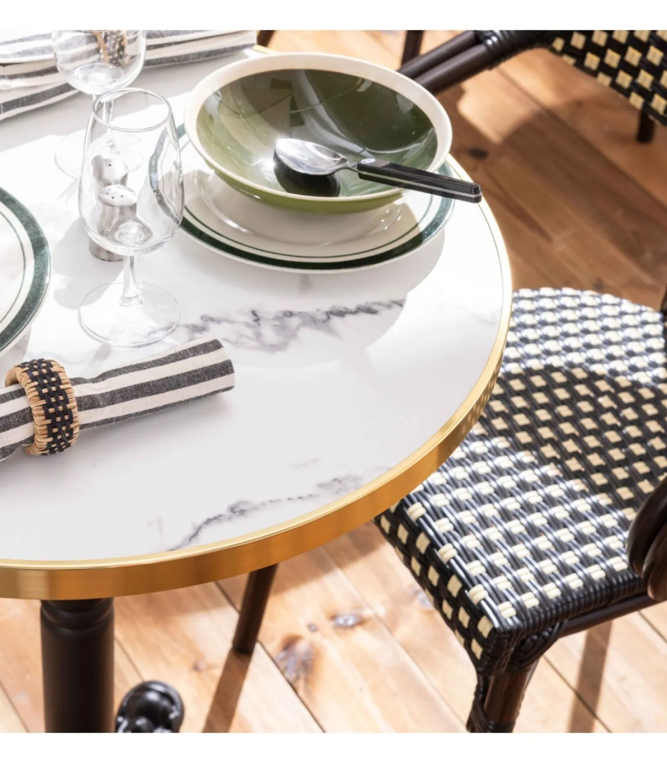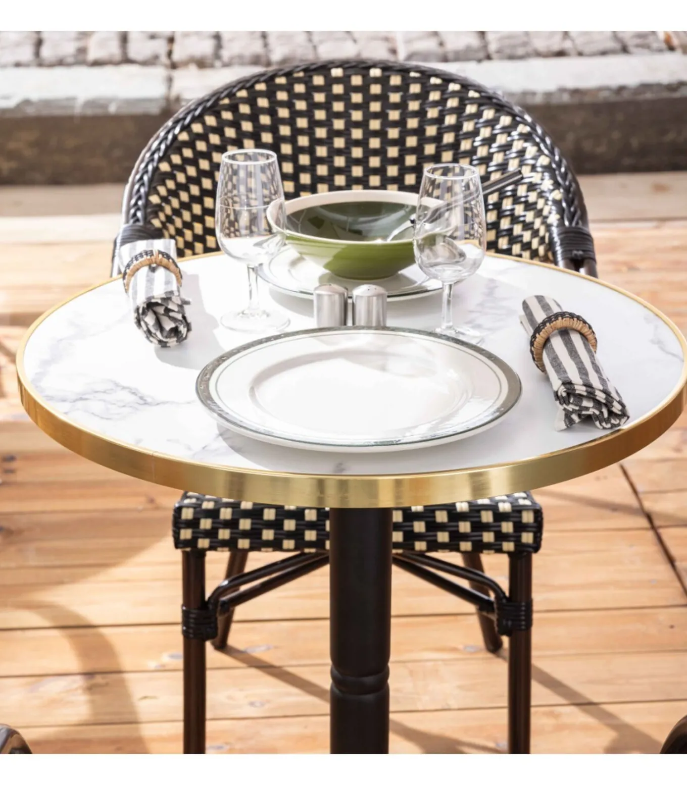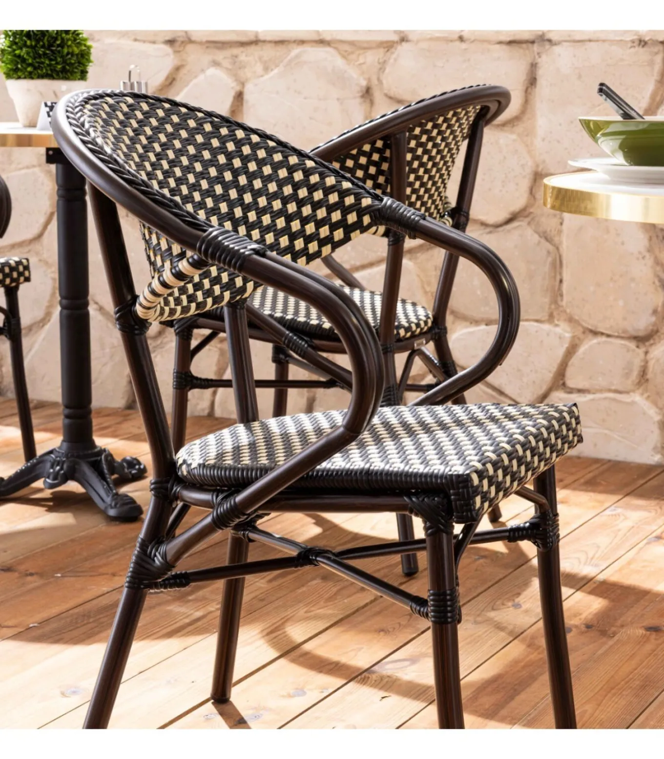 Ontdek onze kantelbare terrastafel met een diameter van 60 cm, vergezeld van twee stoelen in Parijse bistrostijl, ideaal voor horecaprofessionals of om uw buitenruimte te verfraaien. Deze tafel is ontworpen om zowel elegantie als functionaliteit te bieden en is voorzien van een gietijzeren voet en kolom, evenals een bovenkruis van gegoten aluminium, dat stabiliteit en robuustheid in buitenomgevingen garandeert. Het blad is gemaakt van eucalyptus multiplex, bedekt met een melamine blad en randen voor extra stevigheid. Een aluminium rand omringt de bovenkant en voegt een modern tintje toe en beschermt tegen schokken. De epoxyafwerking van de tafelpoot zorgt voor een uitstekende weersbestendigheid, perfect voor buitengebruik. De stoelen, met hun aluminium buizen (28 x 1,5 mm voor de hoofdstructuur en 24 x 1,2 mm voor de armleuningen), bieden duurzaamheid en lichtheid, terwijl ze gemakkelijk te verplaatsen en op te bergen zijn. Met een hoogte van 82 cm, een diepte van 60 cm en een breedte van 57 cm is hun ontwerp ontworpen voor optimaal comfort, met een zithoogte van 45 cm en een rugleuning van 37 cm. Hun bekleding met houteffect draagt bij aan een warme sfeer en is tegelijkertijd gemakkelijk te onderhouden, waardoor ze een verstandige keuze zijn voor caféterrassen, restaurants en bistro’s. Bied uw klanten een vriendelijke en aangename ruimte met deze aantrekkelijke en praktische set, die Parijse stijl en moderne functionaliteit combineert.