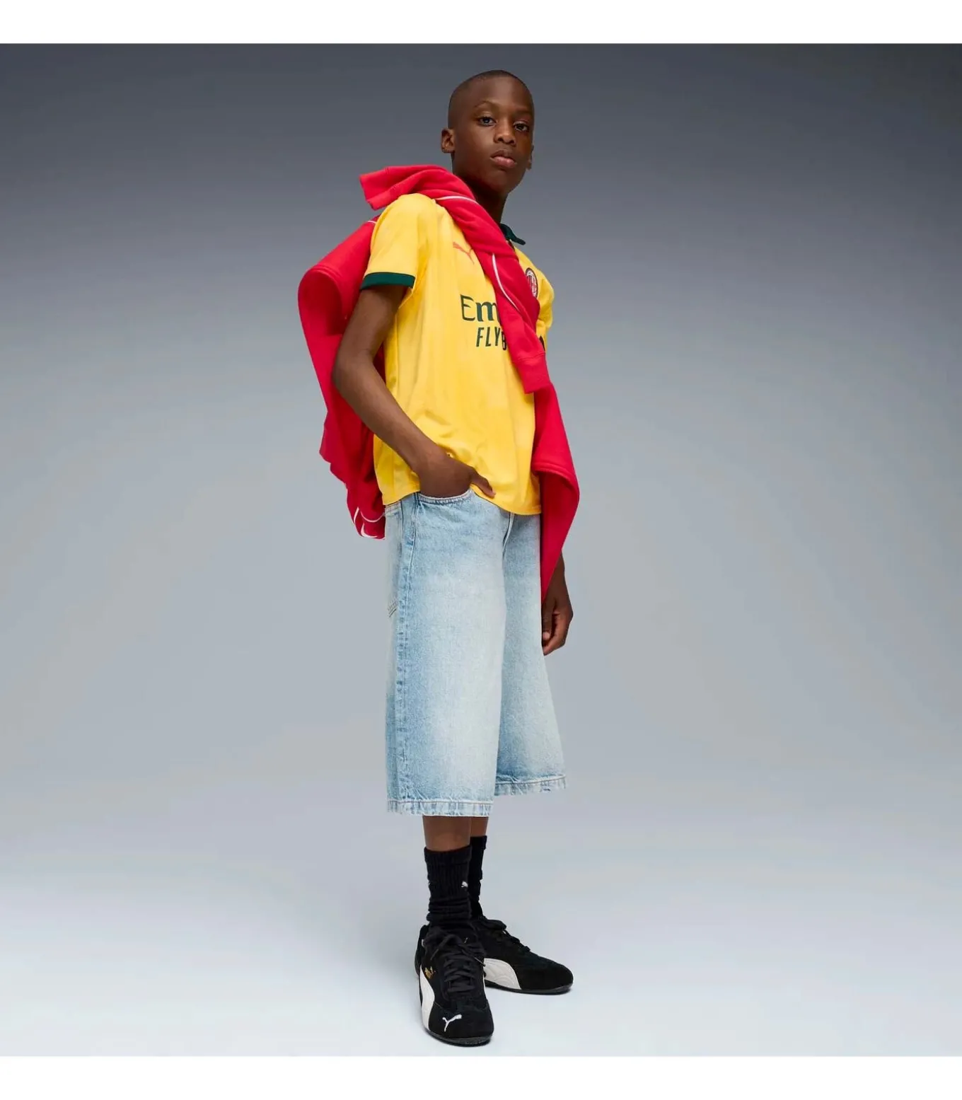 Kleur: Sunny Yellow–Dark Myrtle. Samenstelling: Buitenkant: 100% polyester; kern: 100% polyester. Mouwen: Kort. Halslijn: Polo. Pasvorm: Regular. Veld: Voetbal. Details: AC Milan 25/26 derde wedstrijdshirt in dubbelzijdig jacquardmateriaal met dryCELL–technologie voor vochtregulatie, mesh–panelen voor ademend vermogen, AC Milan–embleem op de borst, Emirates FLY BETTER–sponsor in het midden, PUMA Cat–logo op de rechterborst, ontwerp geïnspireerd op het seizoen 95/96 met ACM–monogram en diepgroene contrasten. Duurzaamheid: Gemaakt met RE:FIBRE–technologie die minstens 95% gerecycled textielafval en andere polyestermaterialen gebruikt. Gebruik: Ideaal voor fans en verzamelaars die voetbalpassie en een unieke stijl willen combineren.