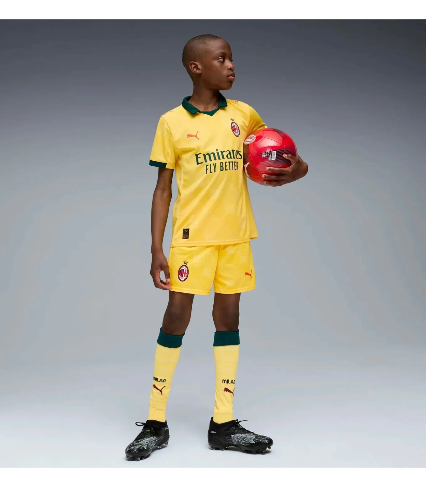 Kleur: Sunny Yellow–Dark. Samenstelling: 100% polyester. Lengte: Boven de knie. Pasvorm: Regular. Veld: Voetbal. Details: AC Milan 25/26 wedstrijdshorts van lichtgewicht en ademend dubbelzijdig jacquardmateriaal met dryCELL–technologie, medium taille, officieel clubembleem en PUMA–logo. Duurzaamheid: Gemaakt van minstens 95% gerecycled materiaal dankzij het RE:FIBRE–programma. Gebruik: Perfect voor jonge voetballers en fans die de kleuren van de Rossoneri willen dragen op het veld en in hun vrije tijd.