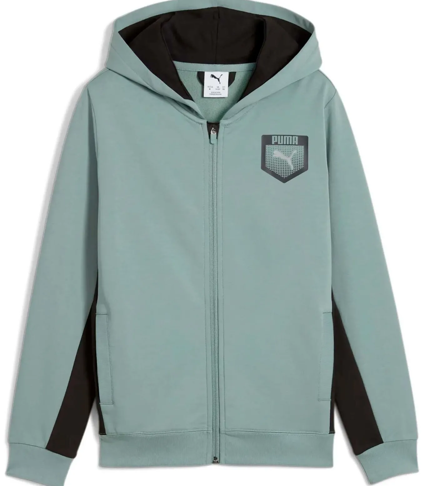* Kleur: Green Moon * Samenstelling: Buitenkant: 67% katoen, 26% polyester, 7% elastaan; Voering capuchon: 100% katoen; Kern: 74% katoen, 26% polyester * Mouwen: lang * Halslijn: capuchon * Lengte: normaal * Pasvorm: normaal * Sluiting: volledige ritssluiting * Details: rubberen grafische print, ritssluiting, zijzak * Duurzaamheid: gemaakt van minimaal 20% gerecycled materiaal * Gebruik: perfect voor jongens van 8 tot 16 jaar die stijl en functionaliteit willen combineren in hun vrije tijd of tijdens sportieve activiteiten. French Terry–stof biedt comfort en bewegingsvrijheid.
