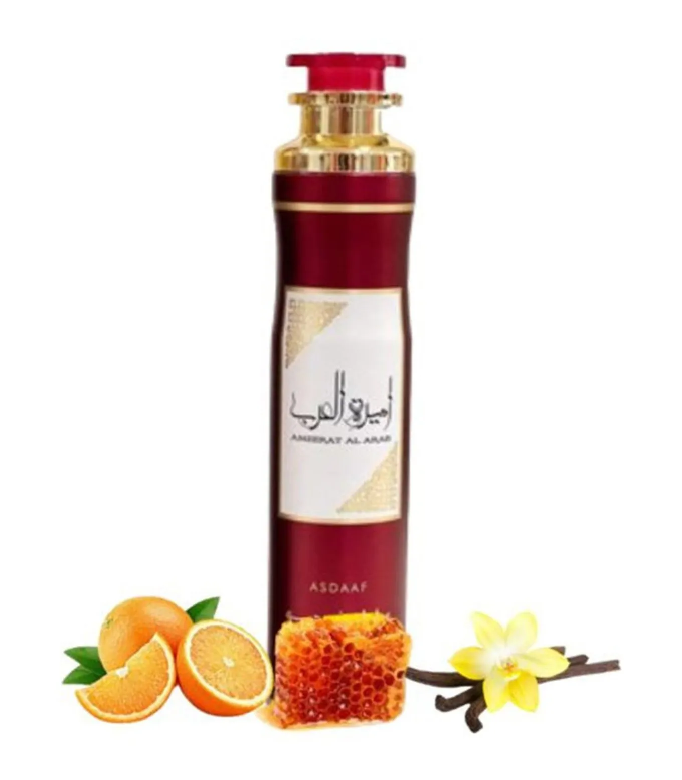 De Ameerat Al Arab Luchtverfrisser van Lattafa, in een fles van 300 ml, verandert uw interieur in een stijlvolle en gastvrije ruimte. Gemaakt door het parfumhuis Lattafa, prikkelt deze huisgeur uw zintuigen vanaf de eerste spray. De topnoten combineren citrus, zoals zoete sinaasappel en bergamot, met delicate kruiden zoals saffraan en kardemom, en brengen frisheid en verfijning in elke kamer. In het hart van de geurbeleving onthult de Ameerat Al Arab Luchtverfrisser betoverende bloemige noten. Jasmijn en neroli mengen zich met roos en subtiele houtachtige tonen, wat een elegante en harmonieuze geur creëert. Met een inhoud van 300 ml verspreidt deze Lattafa–geur langdurig en omhult uw huis met een aura van discreet luxe en verfijning. De basisnoten van de Ameerat Al Arab Luchtverfrisser geven uw interieur warmte en diepte. Musk, amber, sandelhout en vanille zorgen voor een zachte, sensuele afronding, perfect voor een ontspannende en betoverende sfeer. Lattafa levert een hoogwaardige luchtverfrisser in een praktische 300 ml verpakking, ideaal voor elke leefruimte. Breng oosterse elegantie en verfijning in uw huis met deze uitzonderlijke geur.