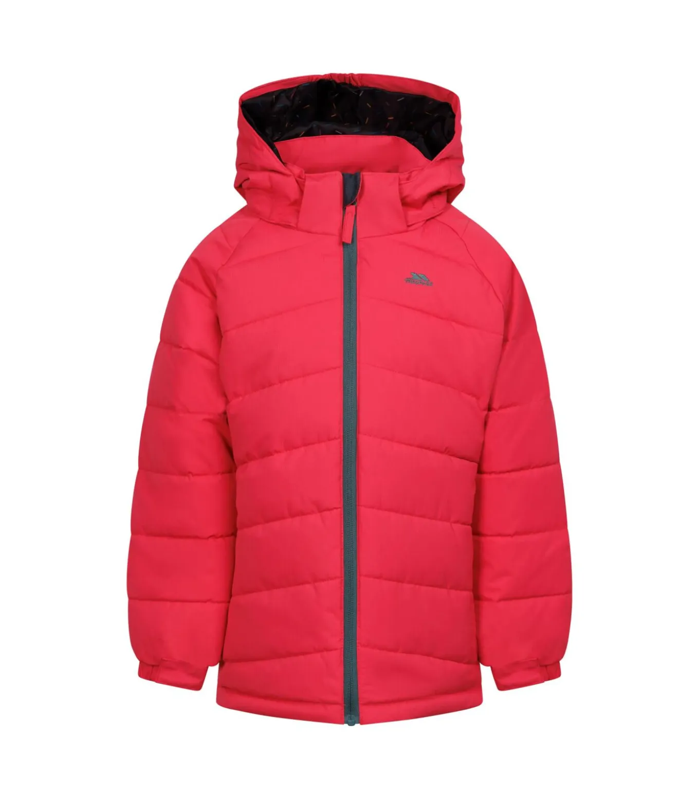 Deze meisjesjas van Trespass is ontworpen om casual te dragen. De gewatteerde constructie zorgt voor warmte en comfort. De bedrukte voering en twee zakken bieden opbergruimte. Verstelbare manchetten met drukknoopsluiting zorgen voor een goede pasvorm. Een afneembare capuchon met afknoopfunctie biedt bescherming tegen de elementen. Een contrasterende hoofdrits zorgt voor ventilatie. De jas is waterdicht tot 2000 mm en winddicht voor buiten. De buitenkant is gemaakt van 100% polyester PVC met een 100% polyester voering en 100% polyester vulling. De maatvoering varieert van ongeveer 21 inch voor een 2/3–jarige tot 31 inch voor een 11/12–jarige.