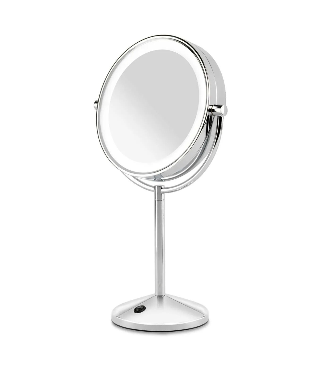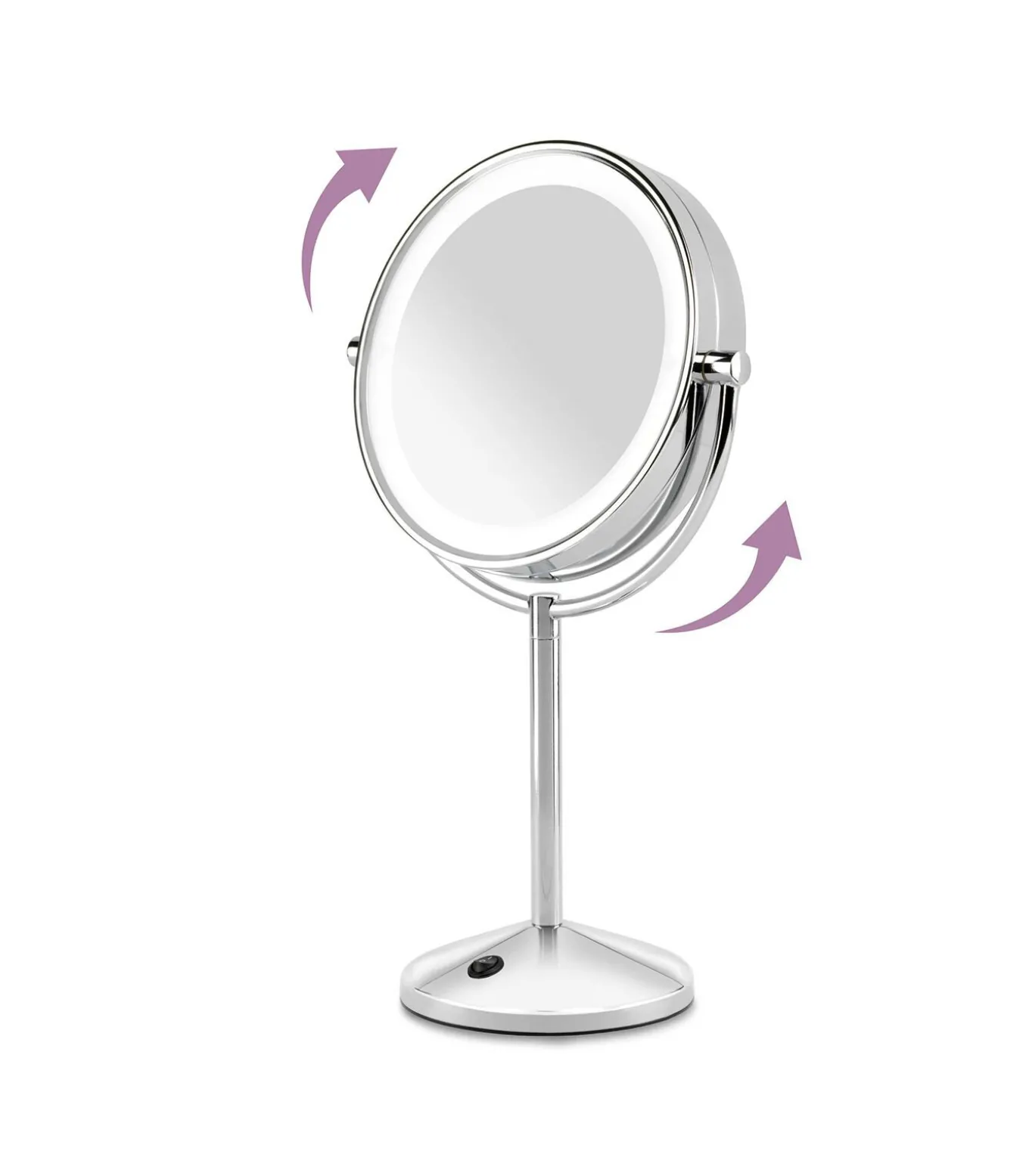 Compact en praktisch, de dubbelzijdige BaByliss Lighted Makeup spiegel biedt zachte verlichting rondom voor uitzonderlijke helderheid. Wissel eenvoudig tussen de reguliere spiegel aan de ene kant en de 10x vergrotende spiegel aan de andere kant, die geschikt is voor het meer gedetailleerde werk. Vereist 3 AA–batterijen.Kenmerken: – Tweezijdige spiegel: 1x normaal zicht en 10x vergroting– Zachte verlichting – 1 lichtstand– LED lamp– Chromen finish– Aan/Uit schakelaar– Snoerloos– Vereist 3 AA–batterijen (niet inbegrepen)– 2 jaar garantie