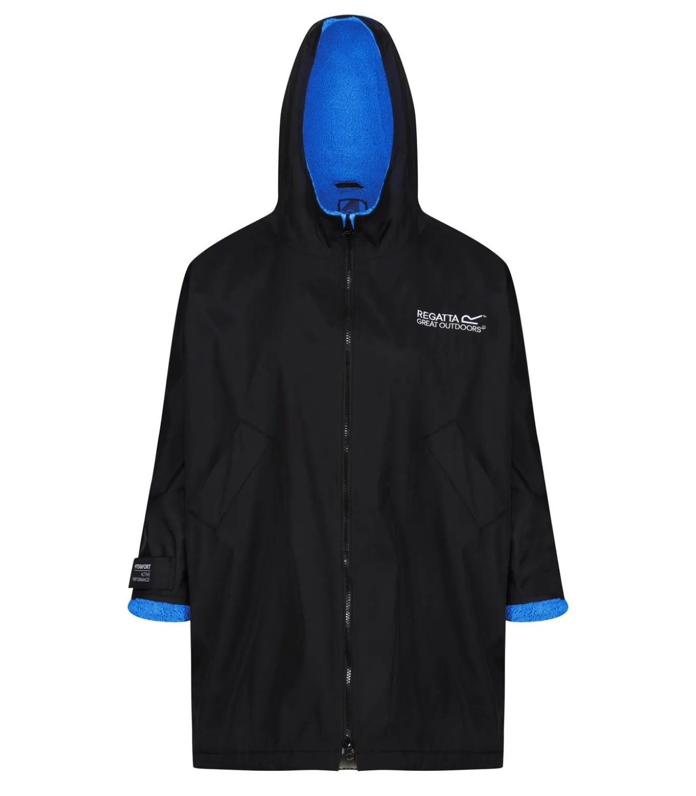 Regatta Back Print – Gi Zwart is een waterdicht, weerbestendig en winddicht kledingstuk gemaakt van 100% polyester met hydrafort 5000 stof en dwr–eindbehandeling. Het ontwerp bevat achterdruk, logo en tekst, voorzien van lange mouwen en getapete naden. De kap is gegroeid op de kap en heeft een overgedimensioneerde pasvorm. Er zijn twee zijzakken en één binnenzak aanwezig en het product wordt vastgehouden met volledige ritssluiting. Het pasbeeld geschikt voor leeftijdsgroepen 5–9 jaar (27 in.) en 9–13 jaar (32 in.).