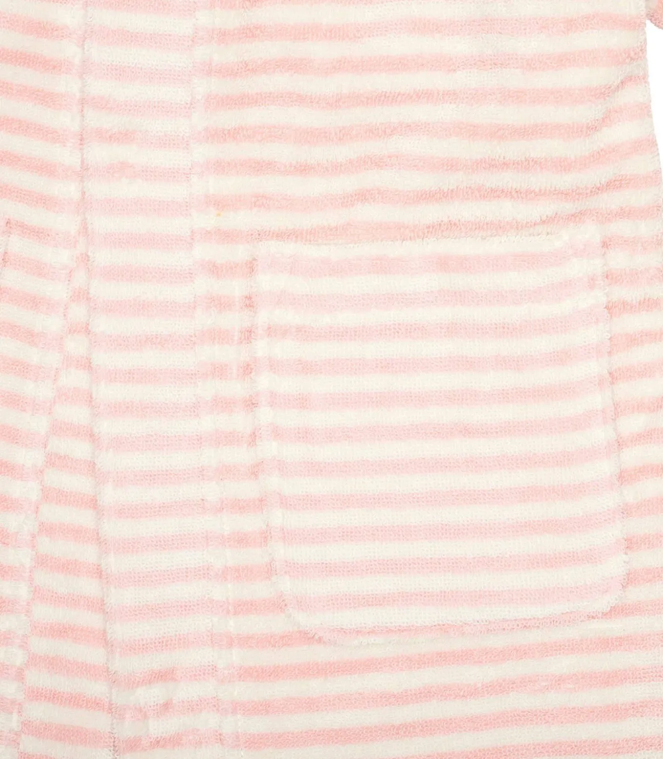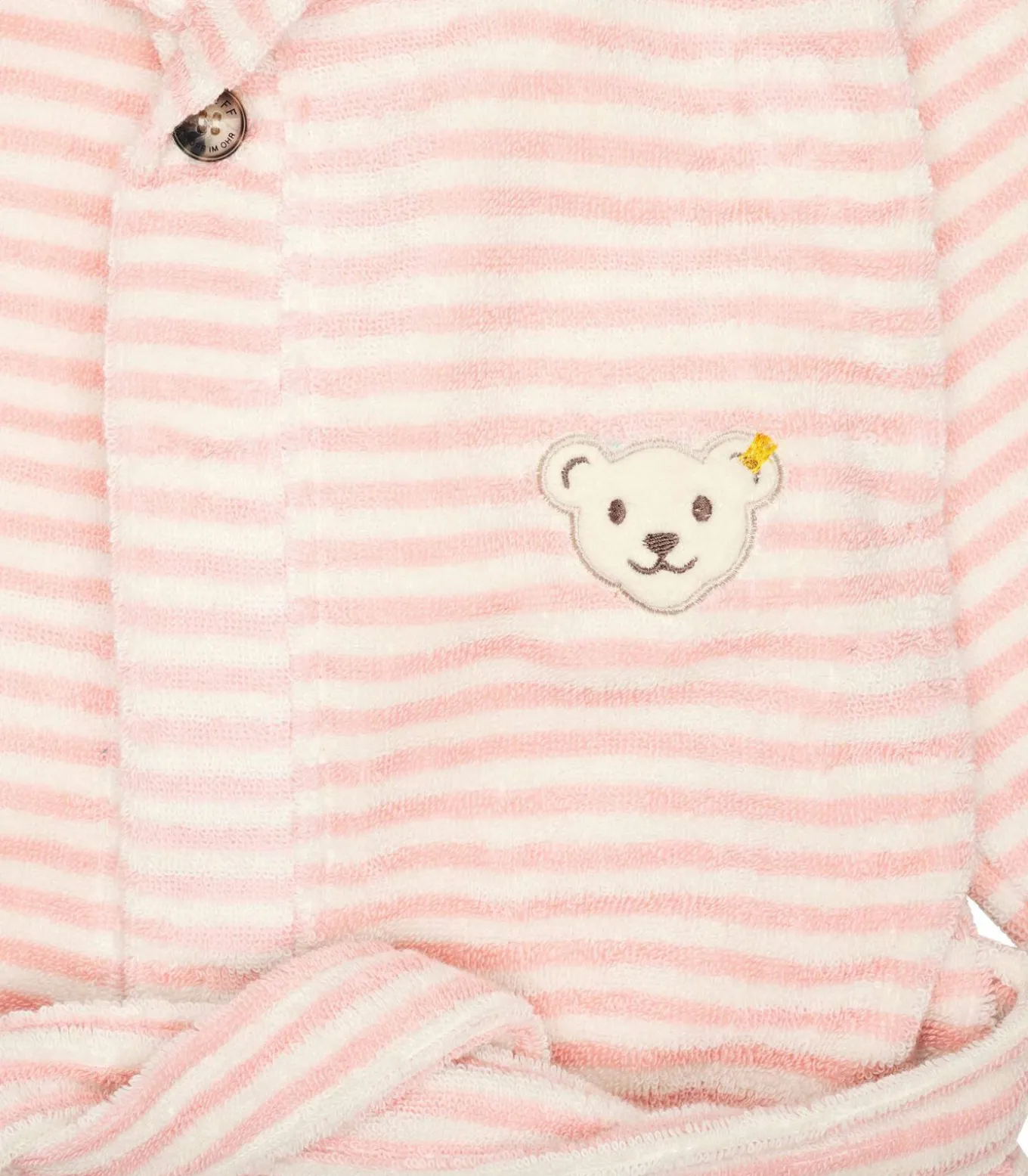Gestreepte badjas voor jongens en meisjes van het merk Steiff. Pluizige jas met een capuchon en twee zakken aan de voorkant. Ceintuur voor een perfecte pasvorm. Klein teddybeermotief op de linkerborst. Aangenaam om te dragen dankzij het zuivere katoen.