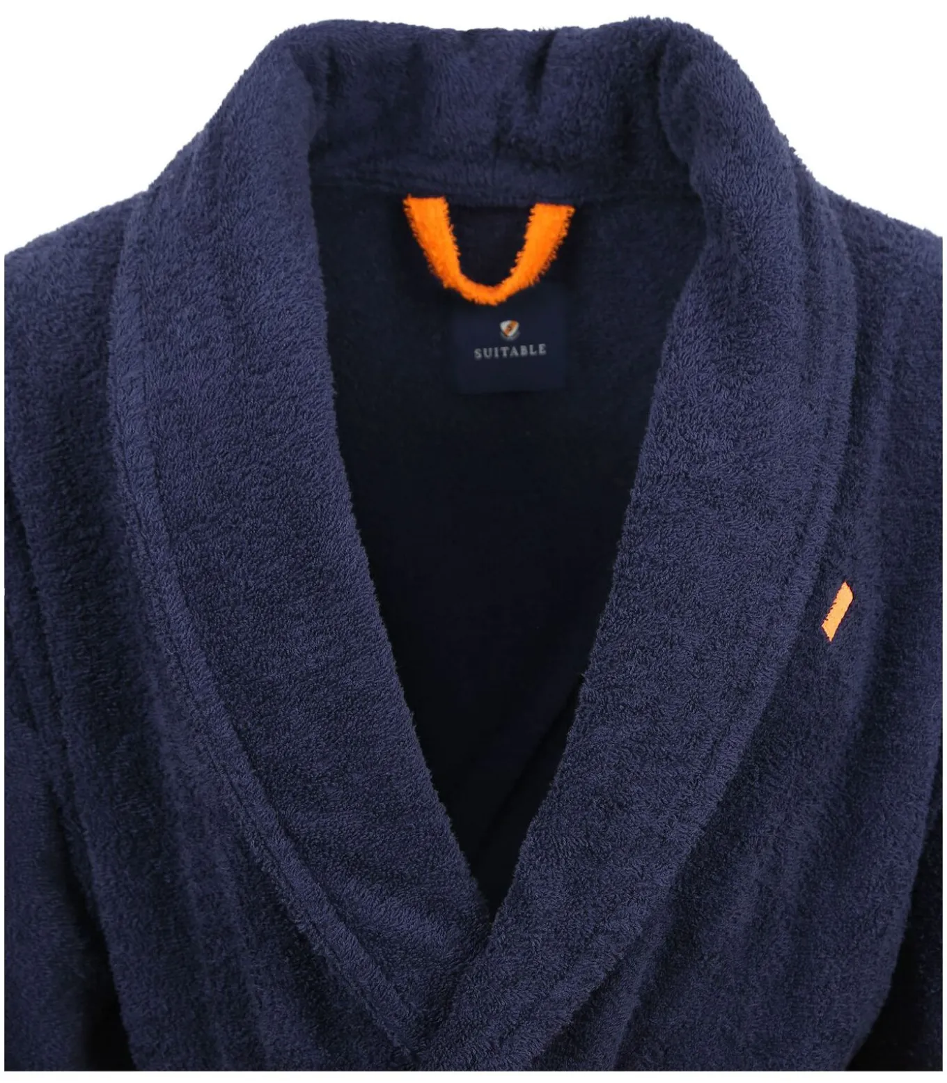 Ga voor een hoog comfort met deze badjas van Suitable. De badjas heeft een effen donkerblauwe kleur en is voorzien van een oranje detail op de borst en een oranje ceintuur. De badjas is ook voorzien van twee steekzakken en een lusje aan de binnenzijde. De badjas is gemaakt van katoen waardoor de badjas een hoog draagcomfort en een zachte touch heeft. De badjas heeft een Regular–Fit pasvorm en valt hierdoor ruim langs het lichaam, waardoor deze je veel bewegingsruimte biedt. Donkerblauwe kleur met oranje merklogoRegular–Fit pasvormGemaakt van 100% katoen