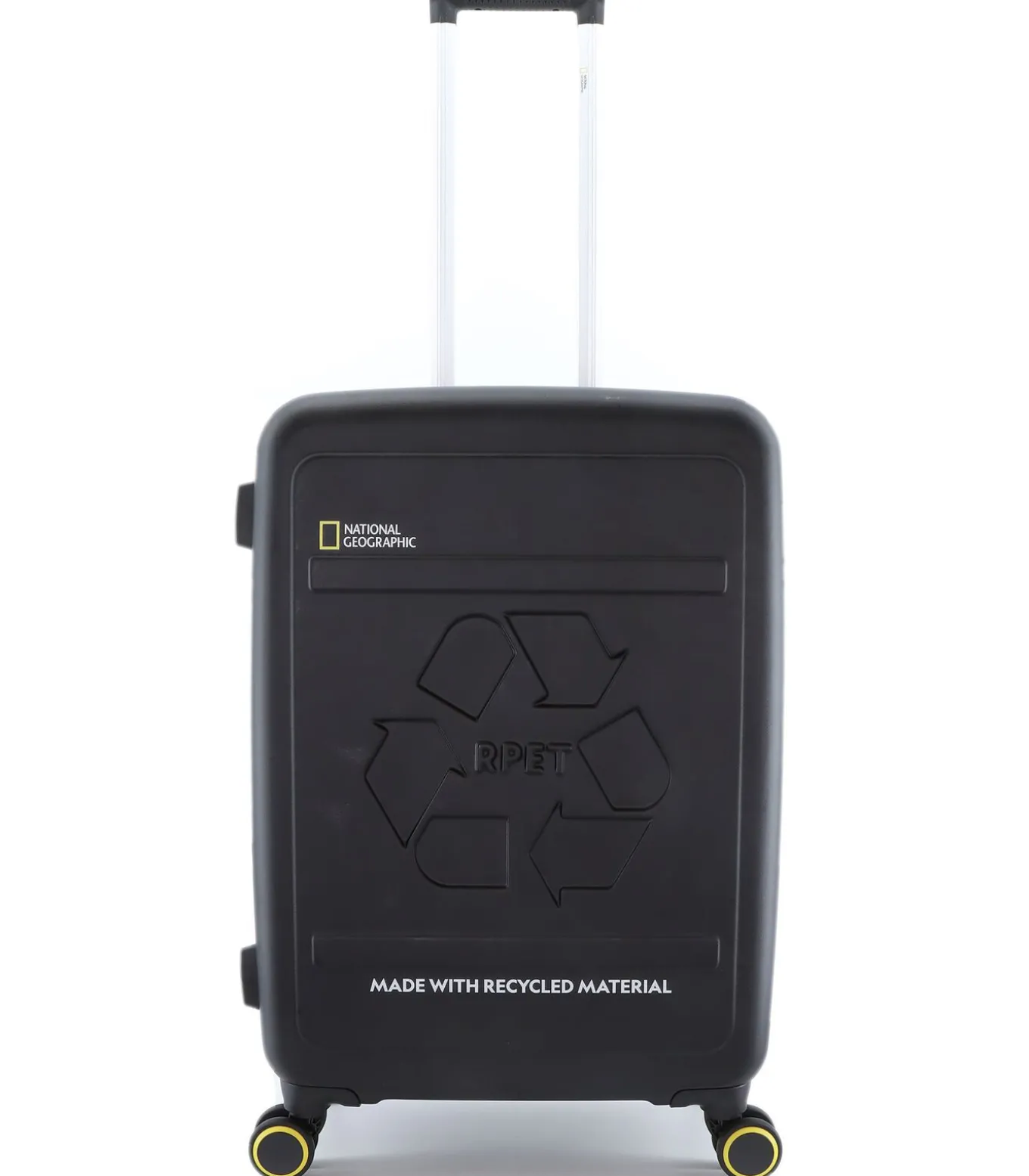‘– Afmeting 66x45x24 cm– Materiaal: RPET– Harde Koffer– Volledig geïntegreerd aluminium trolleysysteem– Handgrepen aan de boven– en zijka– TSA–cijferslot (voor het openen van de koffer door de douane in dien nodig)– Vier kunststof noppen aan de zijkant– Volledig gevoerd interieur met riemen en een U–vormige verdeler met ritsvak– 4 dubbele spinnerwielen– Gewicht: 3.6 kg– Inhoud: 57 liter