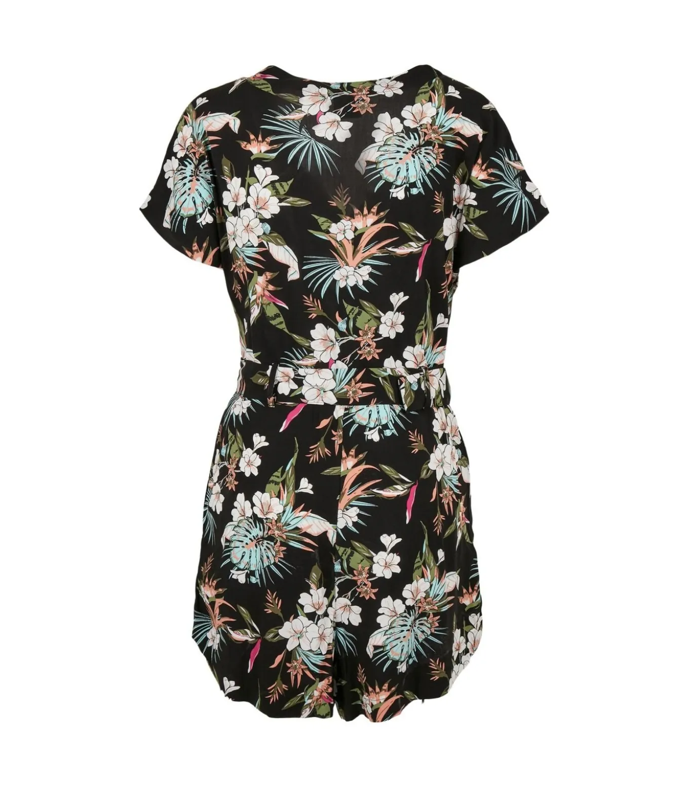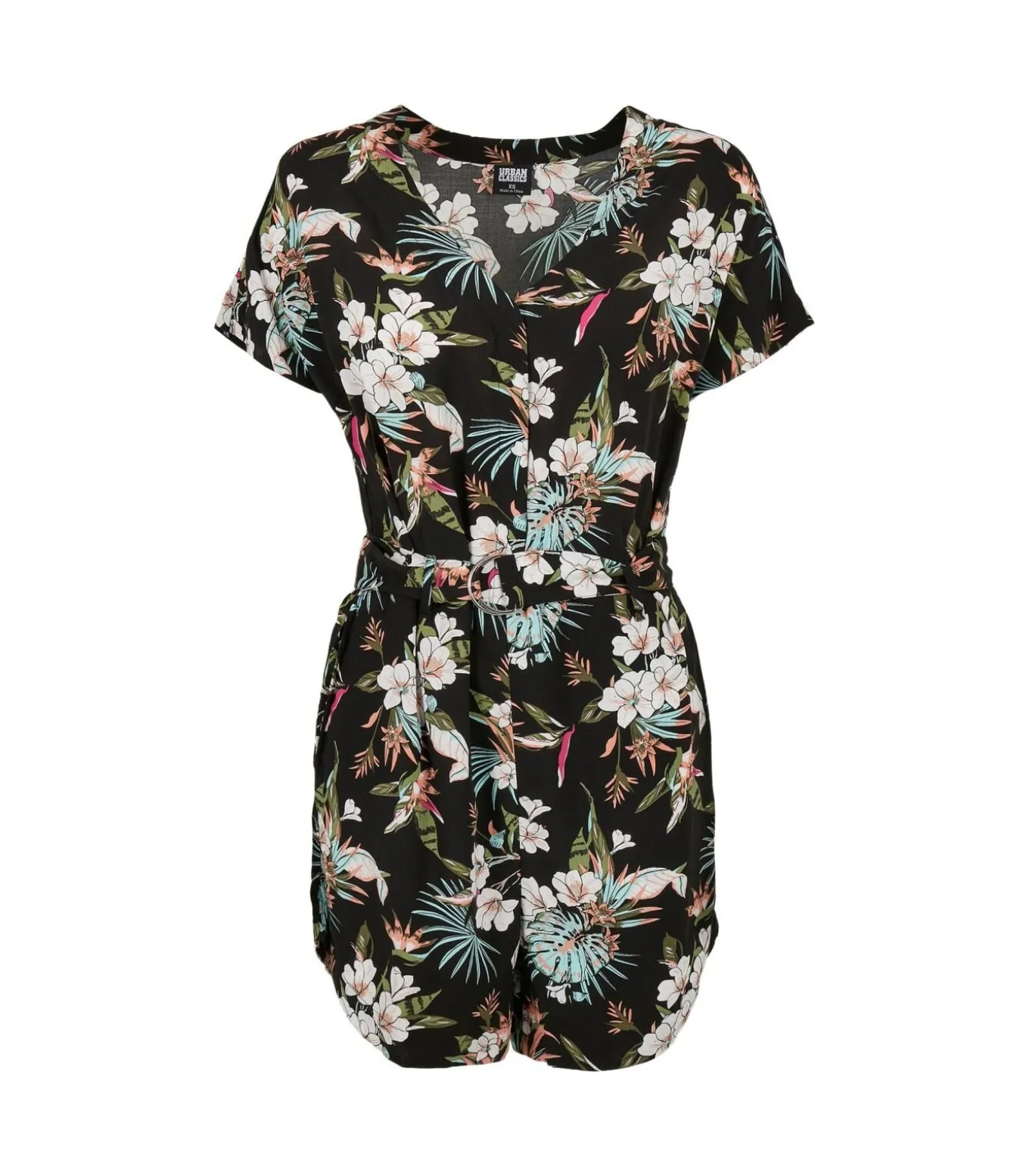 Dit kledingstuk is een korte jumpsuit voor dames van Urban Classics, gemaakt van geweven stof van 100% viscose. Het heeft een opvallende all–over tropische print. De jumpsuit heeft een ontspannen, losse pasvorm en een korte lengte, met een afgeronde zoom. Het heeft korte mouwen en een V–hals. Voor extra gemak heeft de jumpsuit twee steekzakken en een ceintuur in de taille voor een verstelbare pasvorm. De jumpsuit is gemakkelijk te onderhouden en lichtgewicht met 115 gsm. Maatopties zijn XS met een lengte van 33 inch en S met een lengte van 35 inch.