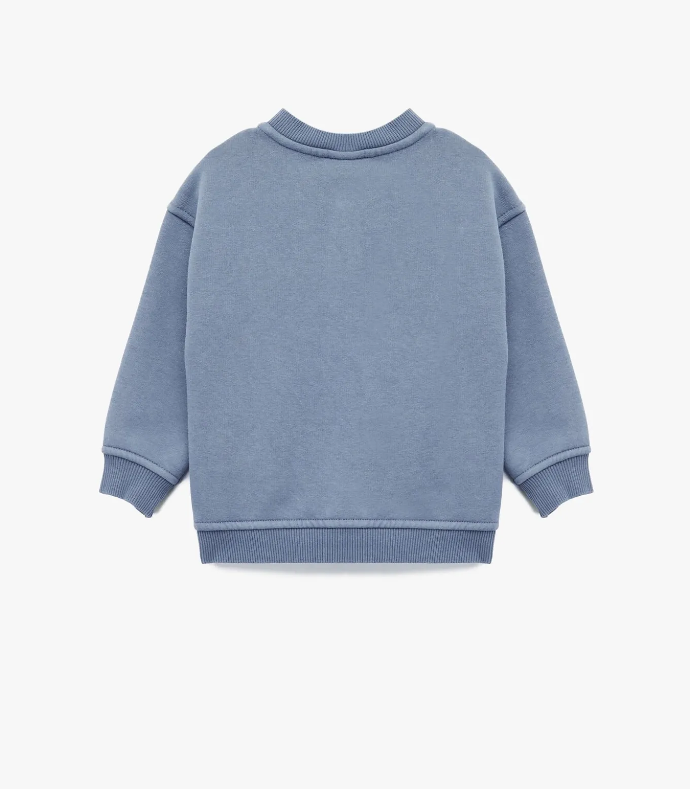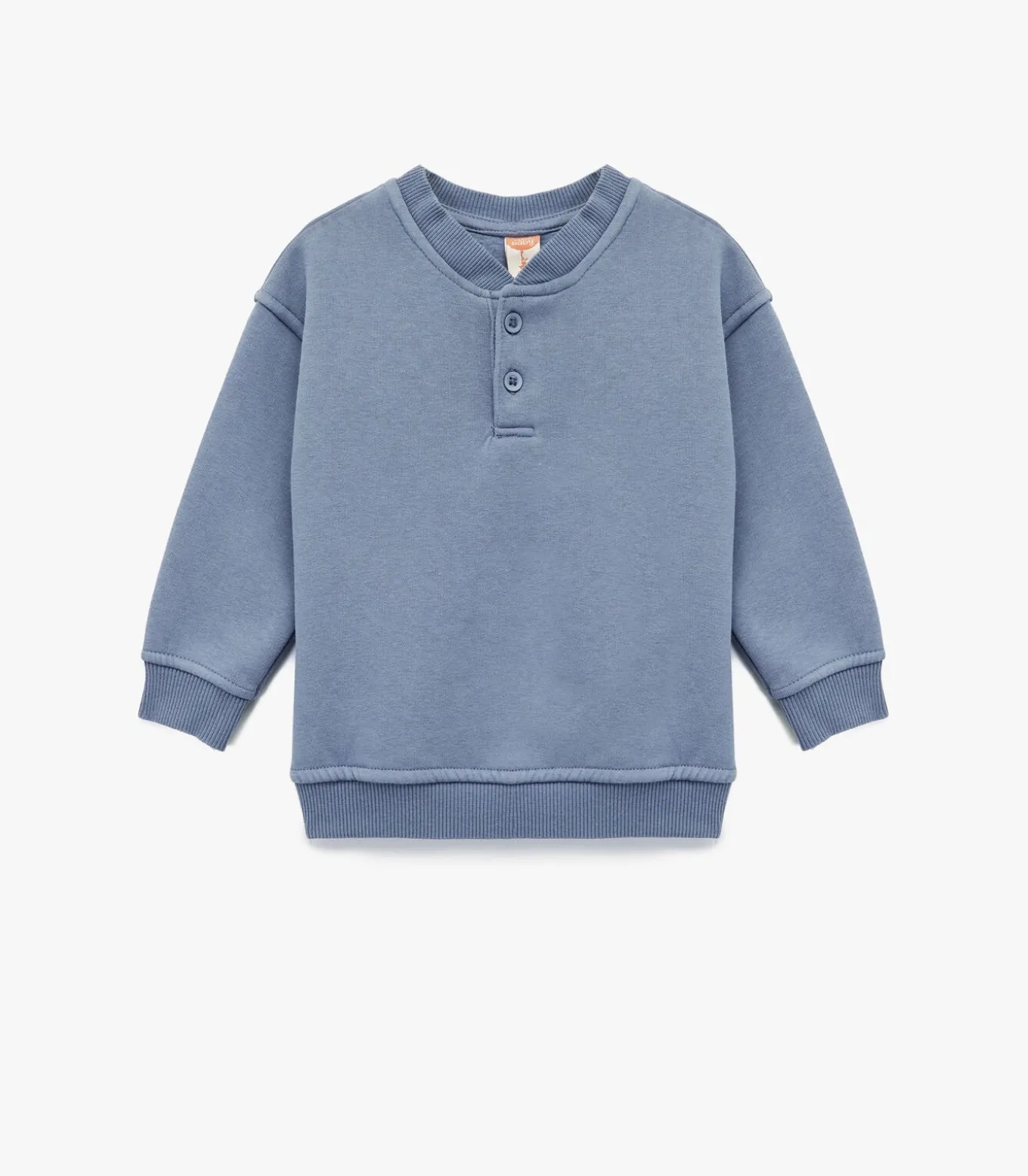 Dit blauwe baby sweatshirt biedt ultiem comfort dankzij de zachte stof. Het heeft een ronde hals en lange mouwen, perfect voor koudere dagen. De knoopsluiting voegt een speels detail toe. Ideaal voor dagelijks gebruik, zowel voor binnen als buiten.