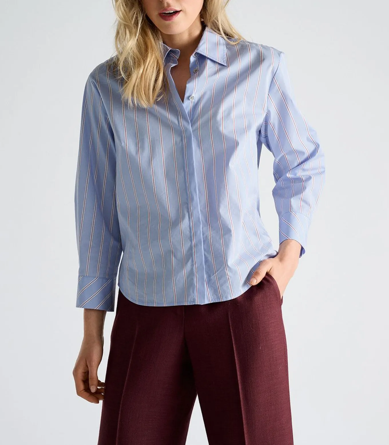 Bloes katoen licht blauw met fijne bordeaux streep