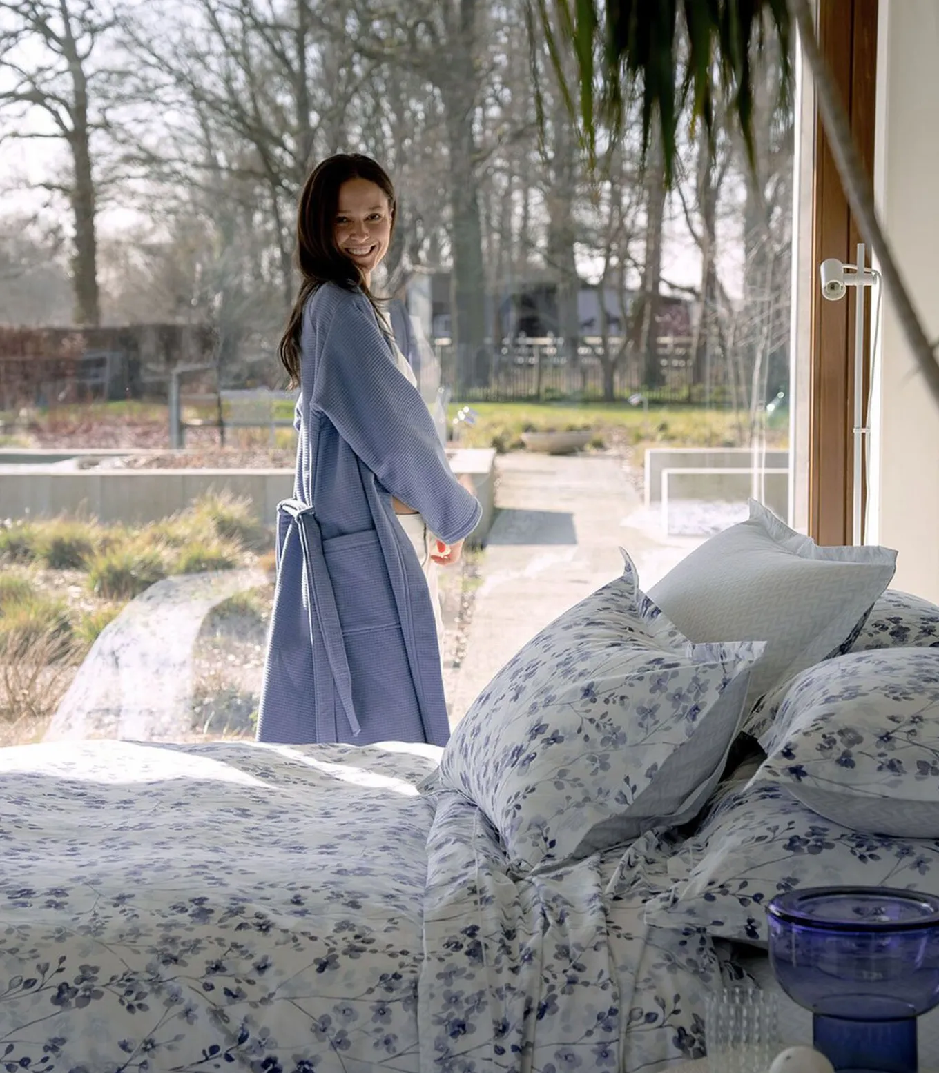 Je verbeelding wiegen op het natuurlijke ritme van het winterlicht. Een blauwige aquarel van kweepeerbloemen sluit aan bij een visgraatmotief en roept een zachte en serene sfeer op