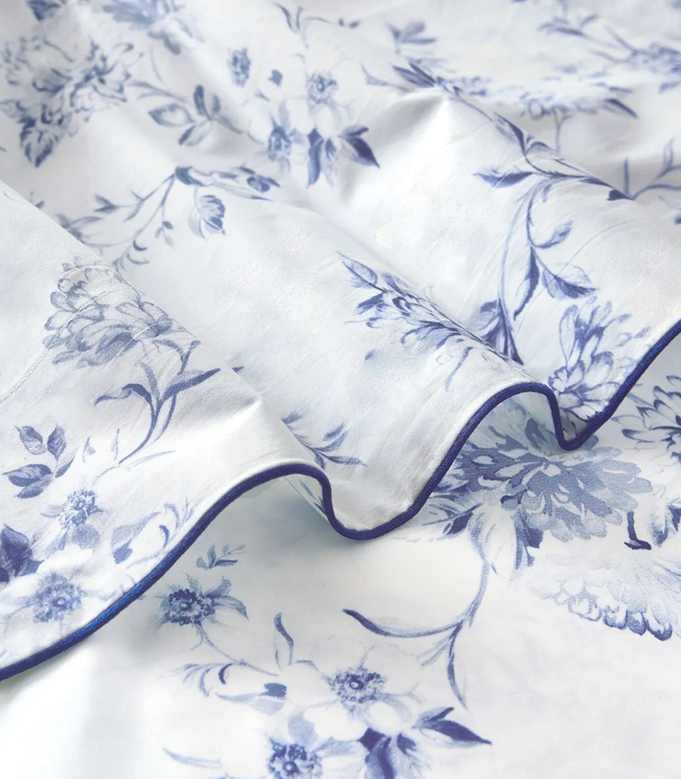 Malacca roept de Oost–Indische Compagnie op en het iconische kobaltblauw van Chinese porselein.Dahlia en rozenbottel komen tot uiting op een witte percal met een subtiel faïencemotief aan de achterkant.