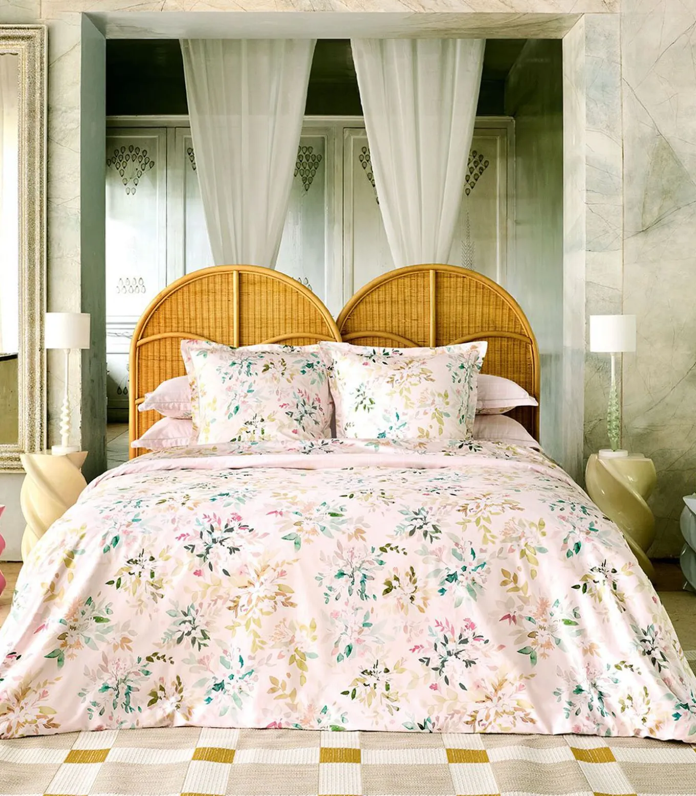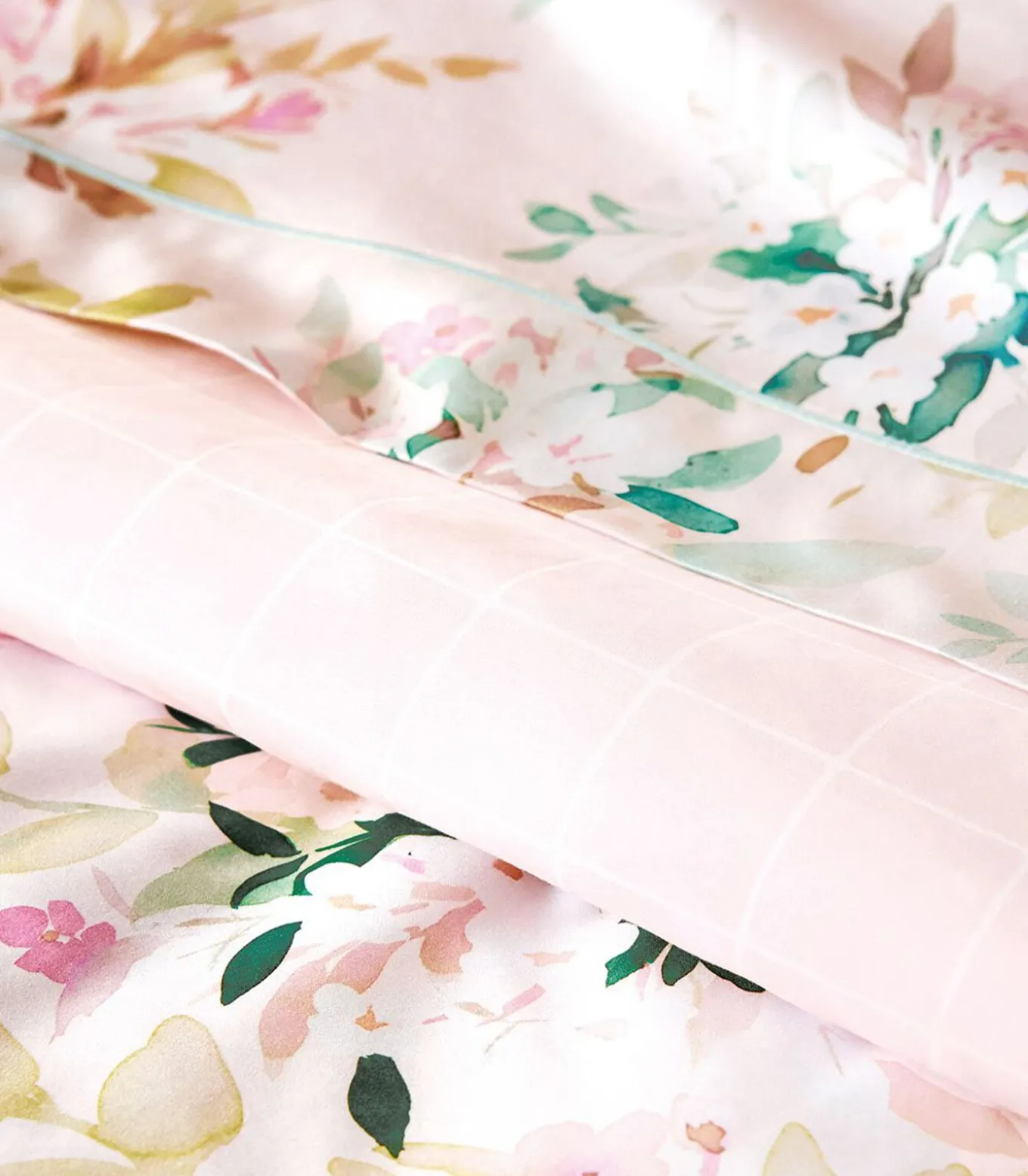 Bedrukking van aquarelbloemen op een lichtroze achtergrond.Bies van 8 cmAfgewerkt met een fijne lichtgroene bourdonsteek.