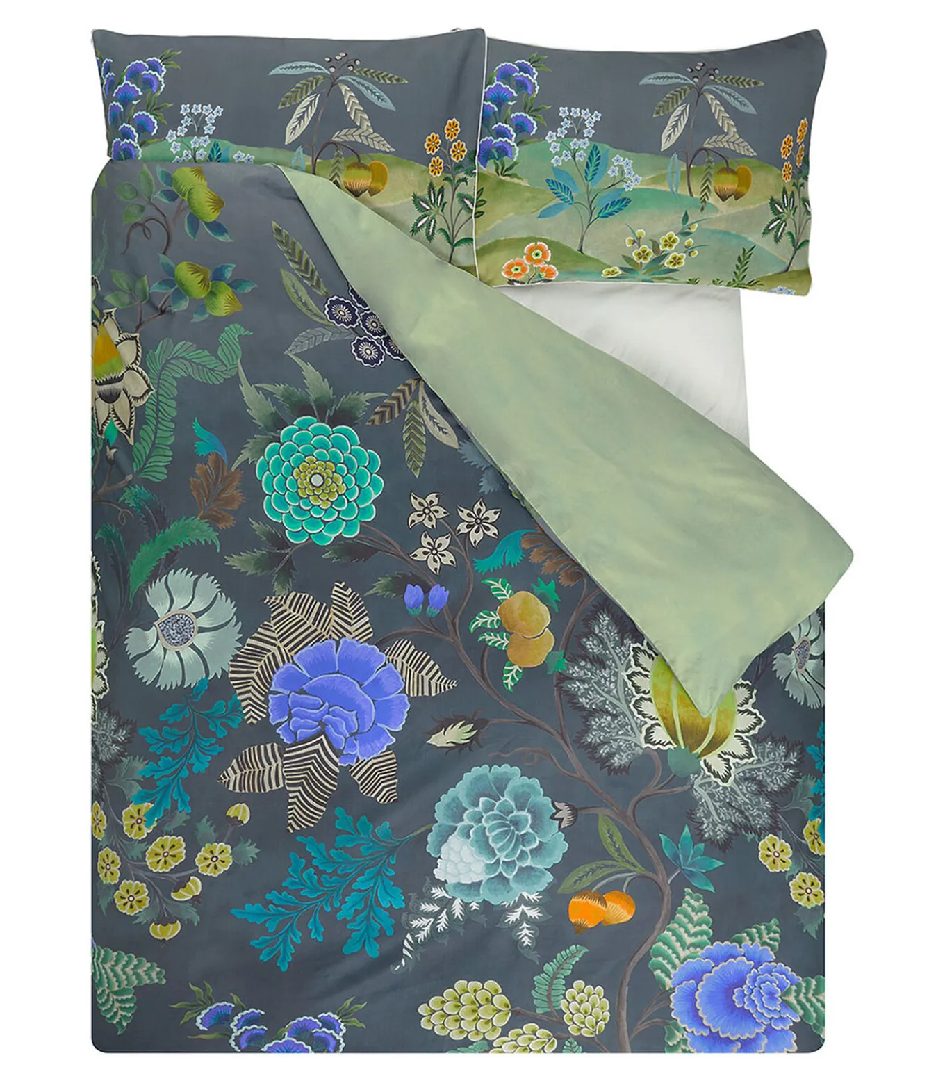 Dit ontwerp heeft een prachtige bloemenprint, met grafische bloemen en gebladerte in levendige kleuren. Het verfijnde motief is geïnspireerd op de brokaatstijl, een zijde versierd met goud– en zilverdraden, wat een luxueus, geraffineerd effect creëert. De subtiele tinten en elegante biezen voegen contrast en diepte toe aan het ontwerp. De meer sobere achterkant brengt het geheel in balans en creëert een warme, rustgevende sfeer in uw slaapkamer. Dankzij de fijne, strakke katoen perkal weving heeft de stof een uitzonderlijke zachtheid en voelt koel aan. Verwen uzelf met gebloemd beddengoed, waarbij elk detail is ontworpen om te zorgen voor elegantie en comfort in uw slaapvertrek.