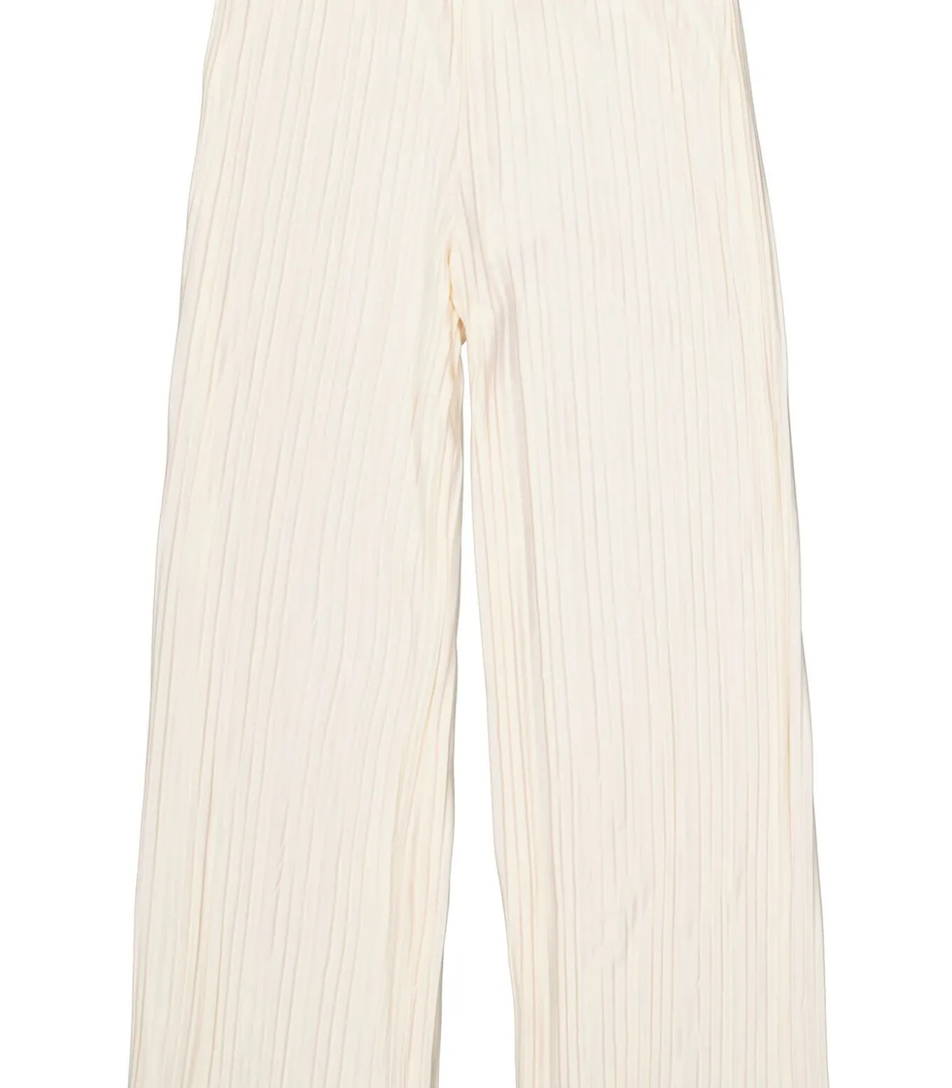 Plissé broek met straight leg. Een fijne basic als deze mag niet ontbreken in jouw garderobe! Deze broek heeft een high waist, een elastische tailleband en een regular fit. Dit item is gemaakt van 65% recycled polyster, 32% viscose en 3% elastaan.