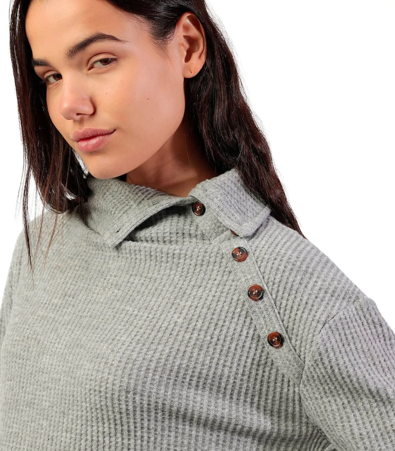 Deze trui heeft een casual maar chique stijl, ideaal voor de koelere seizoenen. Dik geribd breisel dat zacht en warm aanvoelt, asymmetrische opstaande kraag met overslag voor een originele touch. Drie decoratieve knopen op de linkerschouder voegen een stijlelement toe en versterken de asymmetrische kraag. Lange mouwen, recht model en lichtjes los, voor optimaal comfort. Ideaal voor casual chic, perfect voor een cocooning outfit of voor een eenvoudige, elegante herfst–winterlook.[Top apart verkrijgbaar. Kousen, sieraden en andere accessoires die het model op de foto’s draagt, zijn niet inbegrepen].