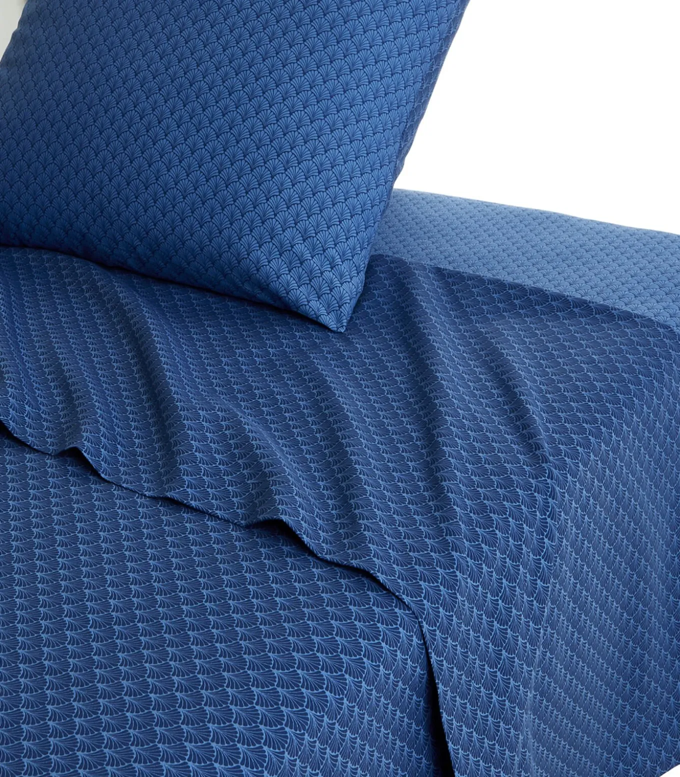 Het laken is bedrukt in een motief met ‘schubben’ (in dezelfde kleur als de keerzijde van het dekbedovertrek) en heeft een omslag met een hoogte van 24 centimeter.