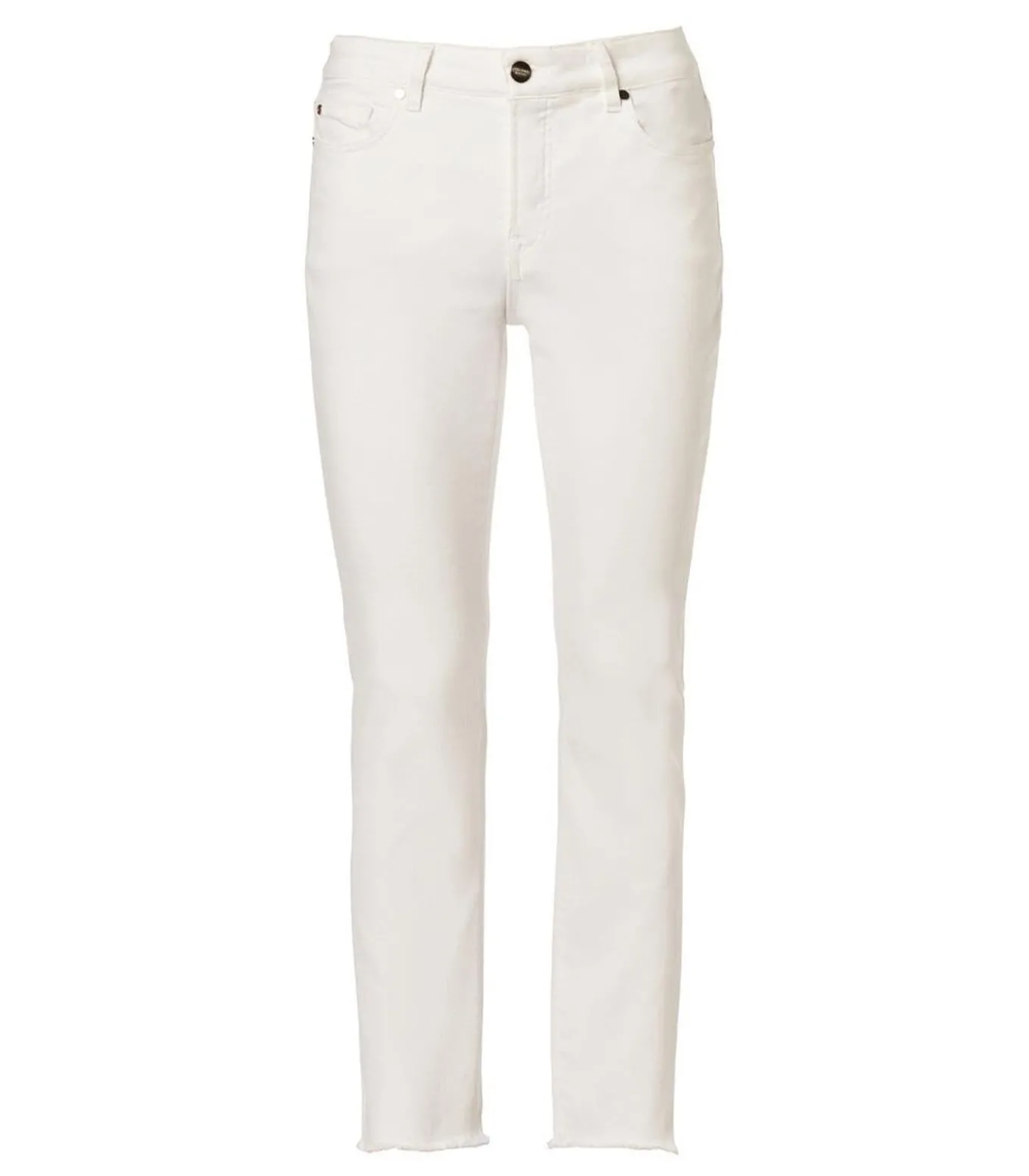 Maak kennis met de Utah denim broek, jouw nieuwe must–have! Deze witte 5–pocket slim–fit jeans combineert zowel stijl als comfort door de stevige ultra–stretch stof die zorgt voor een perfecte pasvorm. De hoge taille en de enkellange broekspijpen zorgen voor een vrouwelijke uitstraling. Het stretchdenim past zich moeiteloos aan je lichaam aan en biedt een maximaal draagcomfort. De gerafelde raw edge zoom en de subtiele distressed details aan de onderkant geven de jeans een stoere, eigentijdse look. Een uniek detail is het geborduurde ontwerp op de achterzak, geïnspireerd door Caroline Tensen’s tatoeage van twee duifjes die de eeuwige liefde symboliseren. Combineer de broek met een denimblouse of kies voor een geborduurde blouse zoals de Nottingham voor een complete look!