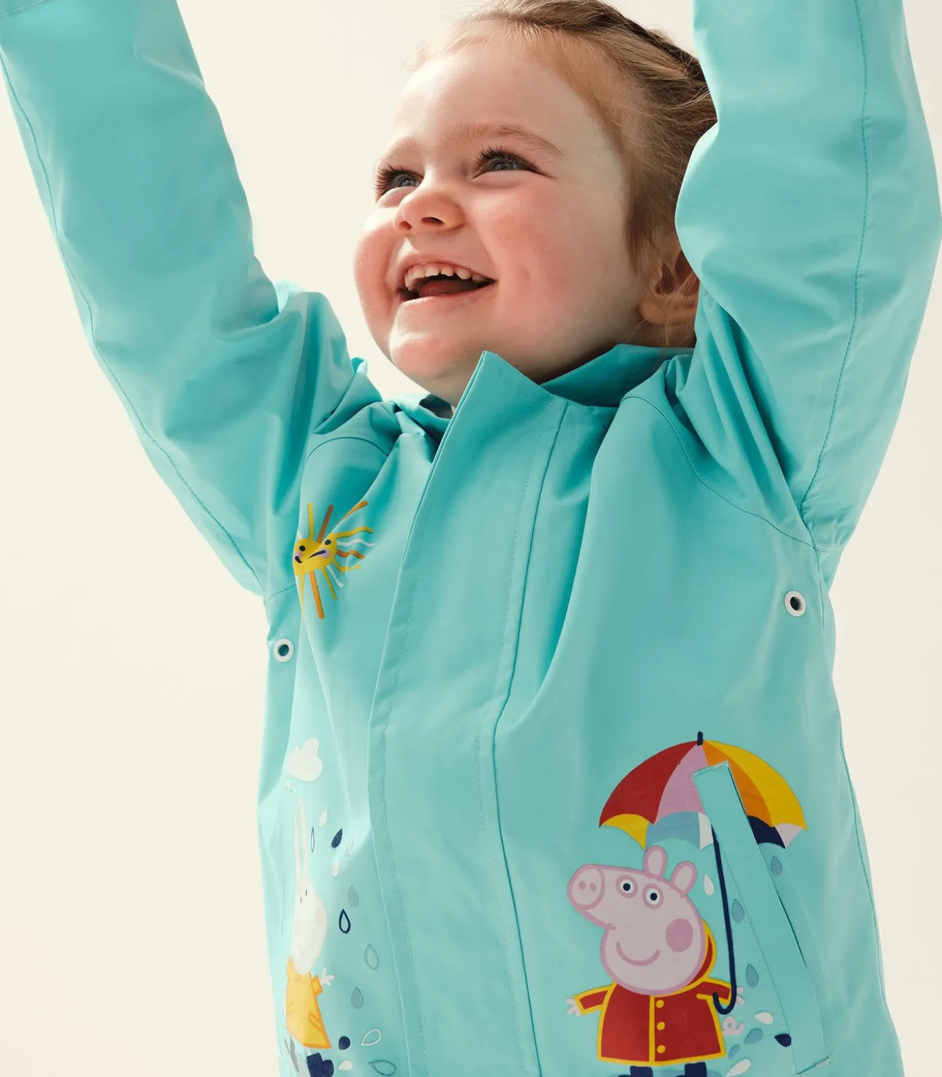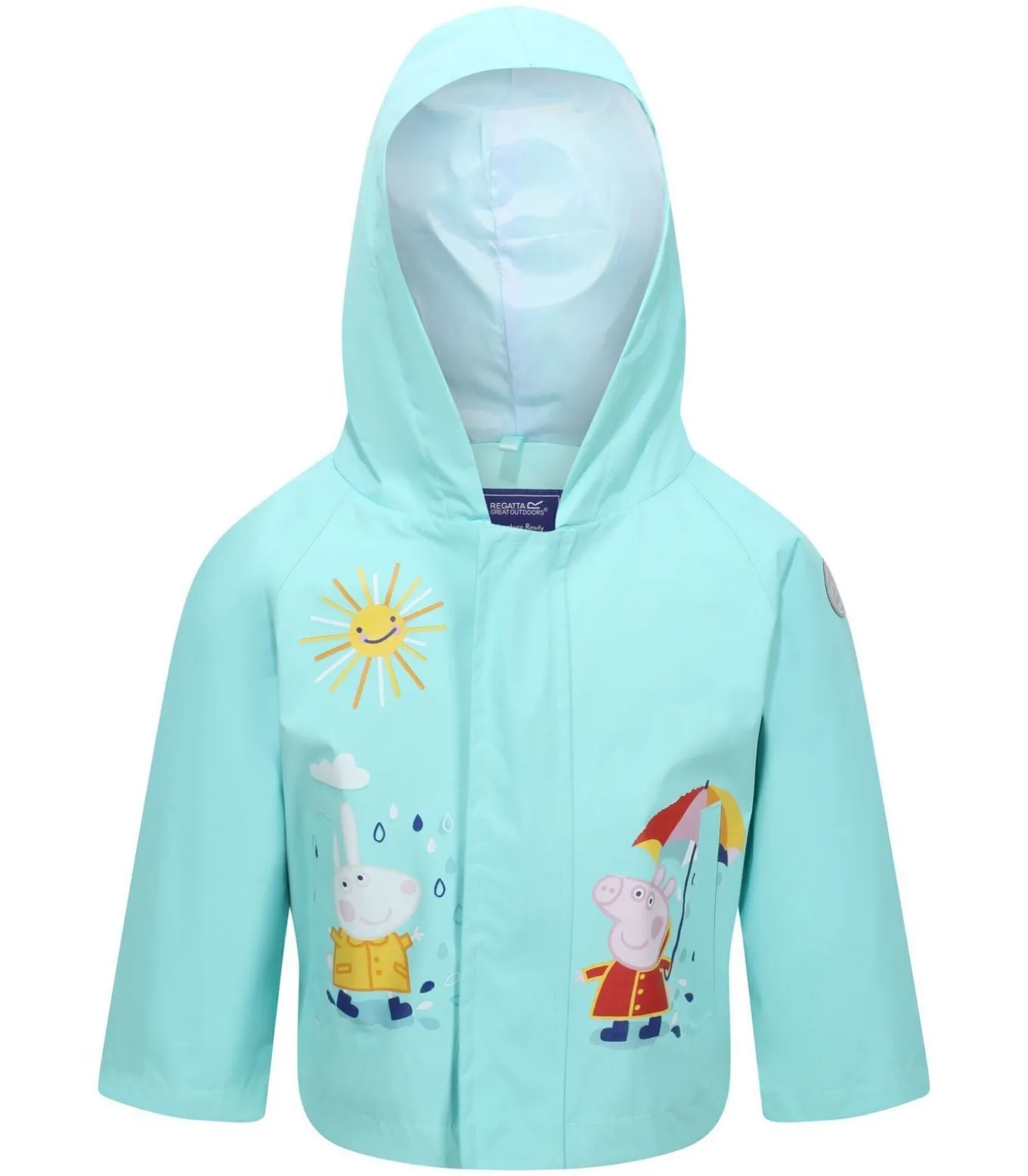 Op deze waterdichte jas van Regatta staan de geliefde kinderfiguren Peppa Pig en Rebecca Rabbit afgebeeld. Het is gemaakt van 100% polyester Hydrafort stof, die lichtgewicht en ademende bescherming biedt tegen regen en zon. De waterdichte en zonwerende technologie van de stof beschermt kinderen tijdens het buitenspelen. Reflecterende randen verhogen de zichtbaarheid bij weinig licht. Een meegroeibare capuchon met drukknoopsluiting houdt het hoofd droog. Twee zakken aan de onderkant bieden opbergruimte. Lange mouwen en een voorgevormde zoom maken de bedekking compleet. Met deze jas kunnen kinderen buiten avonturen beleven terwijl ze beschermd blijven tegen de elementen.