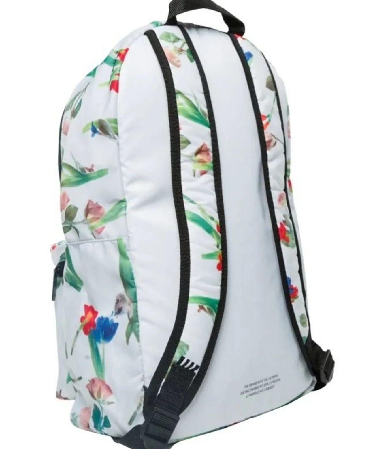 Adidas Classic Wit Zakdoek met een–een rugzak. Deze zakdoek heeft 1 voorzak en ritssluiting. Het hoofdcompartiment telt 1 compartment. Er is een verstelbare schouderriem en grijpgreep. Het ontwerp van deze zakdoek is alle–alle overdruk met bloemen en logo. Deze zakdoek wordt vastgezet met twee–twee ritzen.