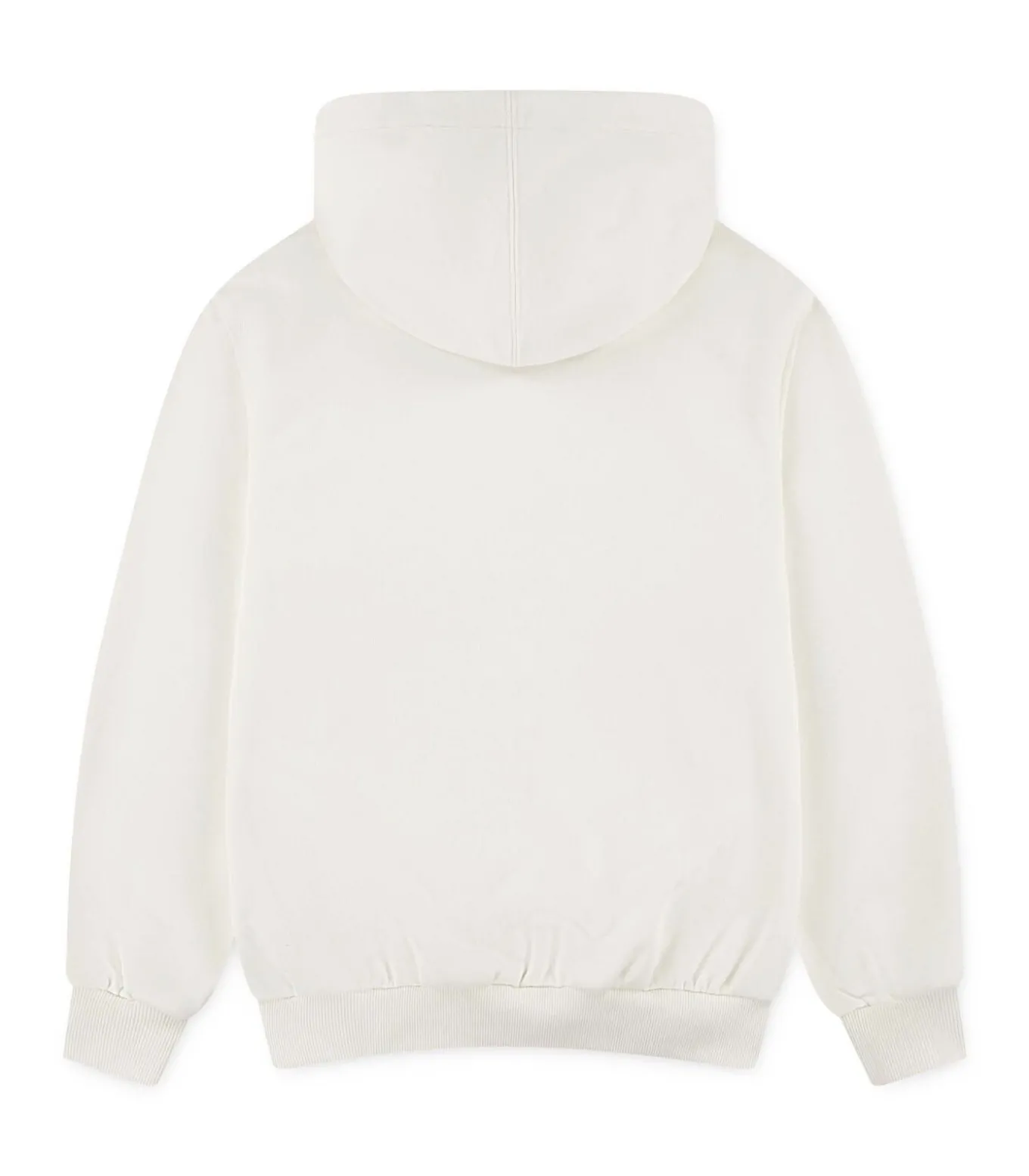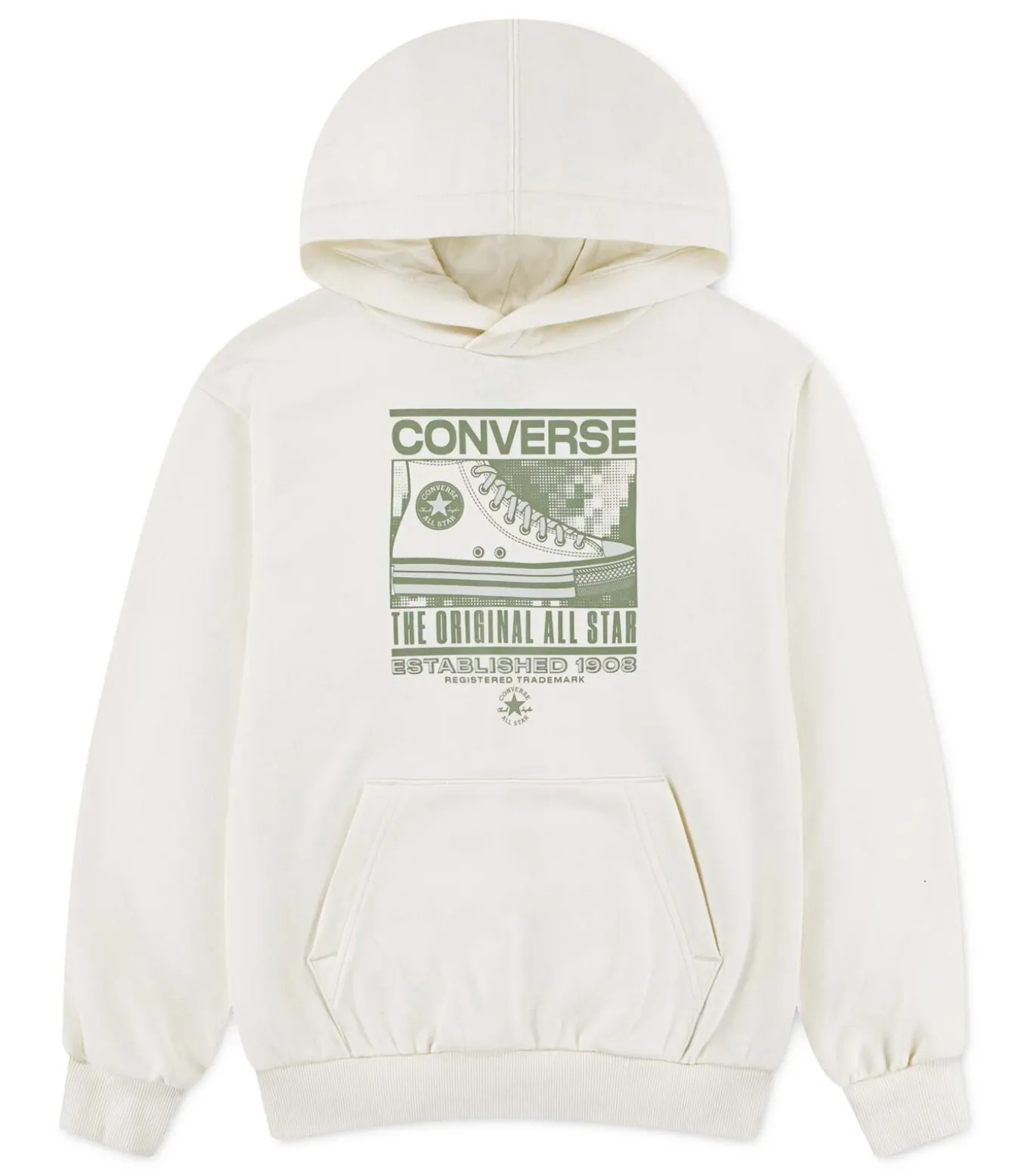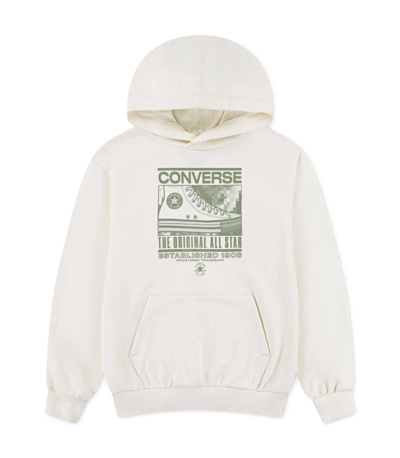 Kleur: Egret Samenstelling: 60% katoen, 40% polyester Mouwen: lang Pasvorm: regular fit Details: vaste capuchon, kangoeroezak, geribbelde manchetten en zoom, print op de voorkant met Converse sneaker–graphics en The Original All Star–opschrift Gebruik: ideaal voor kinderen die van comfort en stijl houden, perfect voor school en vrije tijd