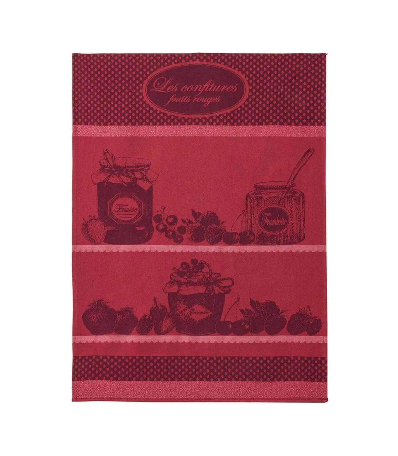 Net als de afbeelding toont de theedoek de rode kleuren van deze kleine zoete lekkernijen.