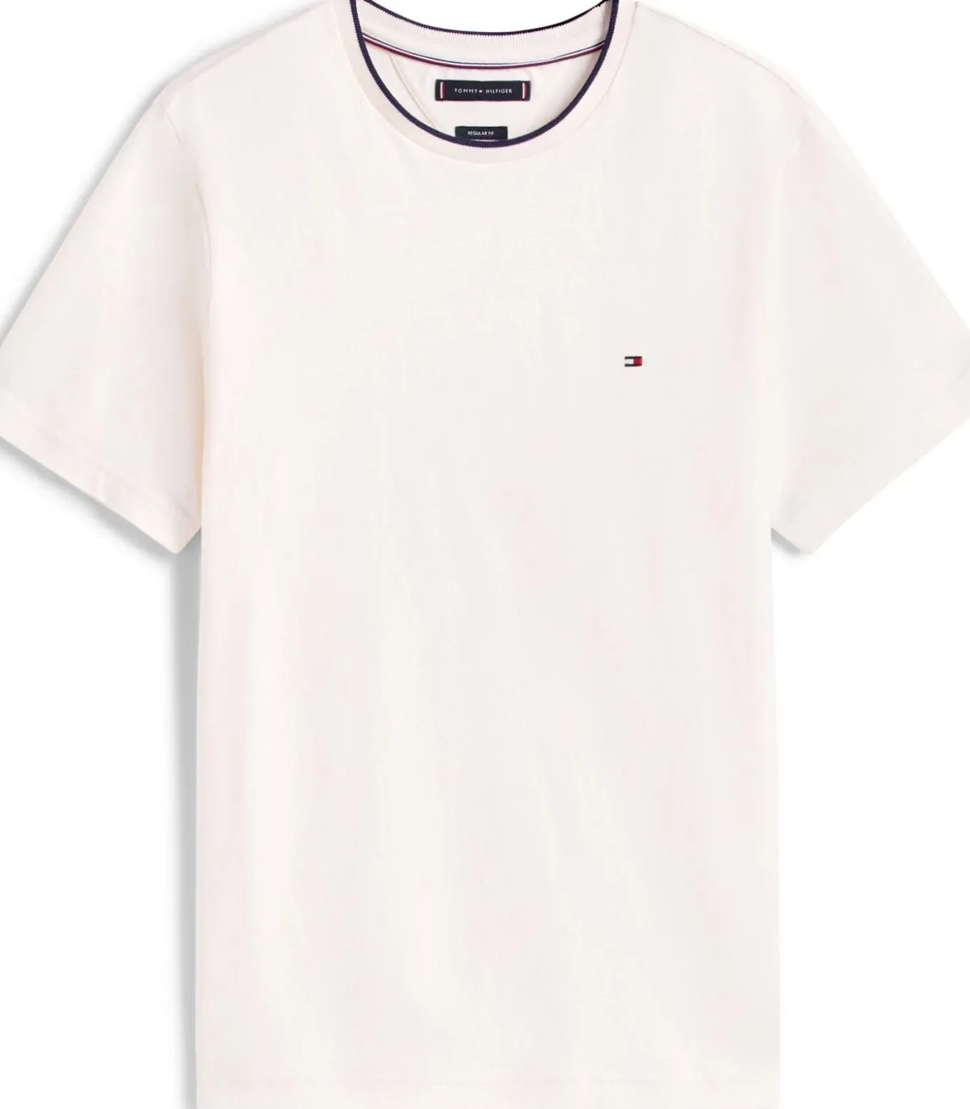 Kleur: Ivory Petal. Samenstelling: 60% modal, 40% katoen. Mouwen: Kort. Halslijn: Ronde hals. Pasvorm: Regular Fit. Details: Contrasterende streep langs de halslijn, kenmerkende tape in de nek, geborduurde Tommy Hilfiger–vlag op de borst. Duurzaamheid: Gemaakt met modalvezels uit hernieuwbare en duurzaam beheerde houtbronnen. Gebruik: Perfect voor praktische en casual kleding, geschikt voor veelzijdige dagelijkse looks.