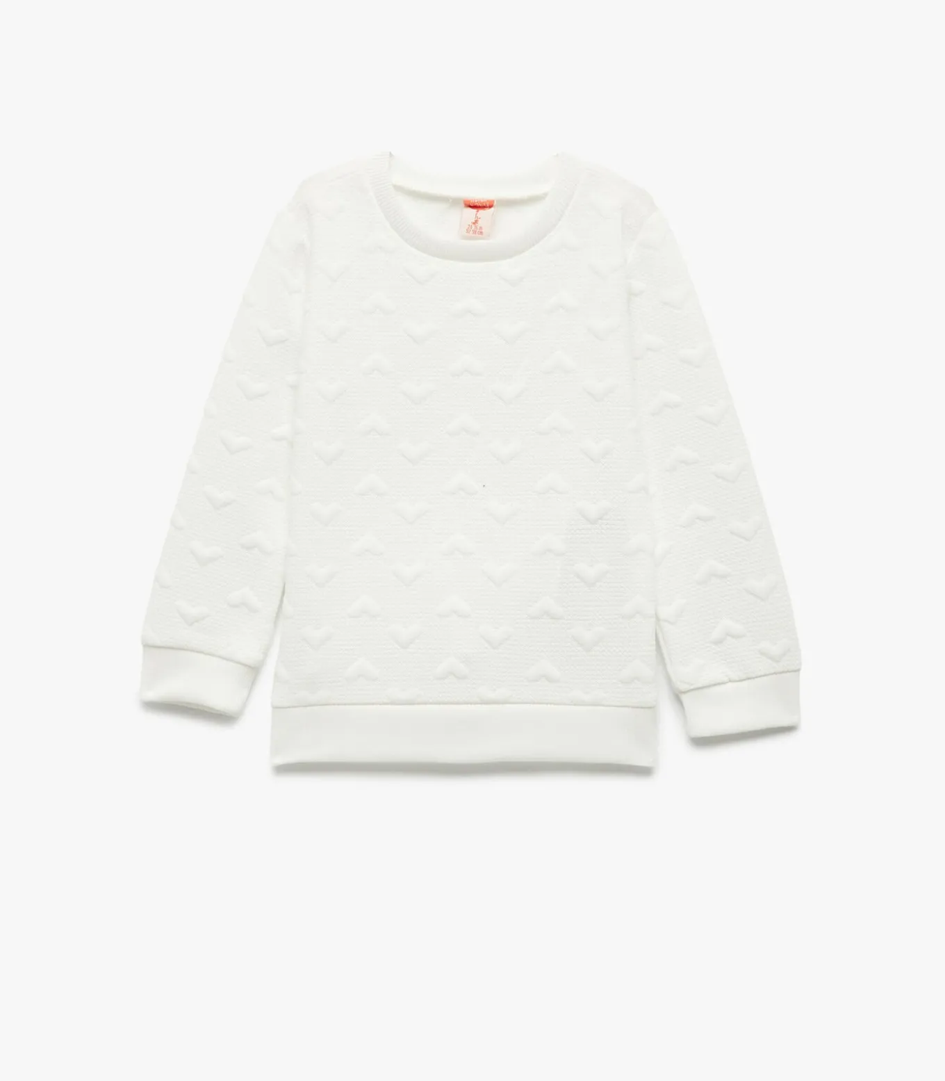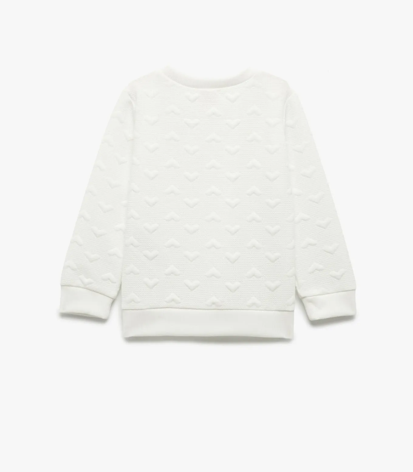 Deze crèmekleurige meisjestrui combineert comfort en stijl dankzij het schattige hartjes jacquardpatroon. Met de ronde hals en lange mouwen biedt het optimale bewegingsvrijheid voor speelse dagen. Perfect voor zowel binnen als buiten dragen, dankzij het zachte en rekbare materiaal dat de hele dag comfortabel aanvoelt. Voeg een vleugje schattigheid toe aan de garderobe van je kind met deze tijdloze trui.