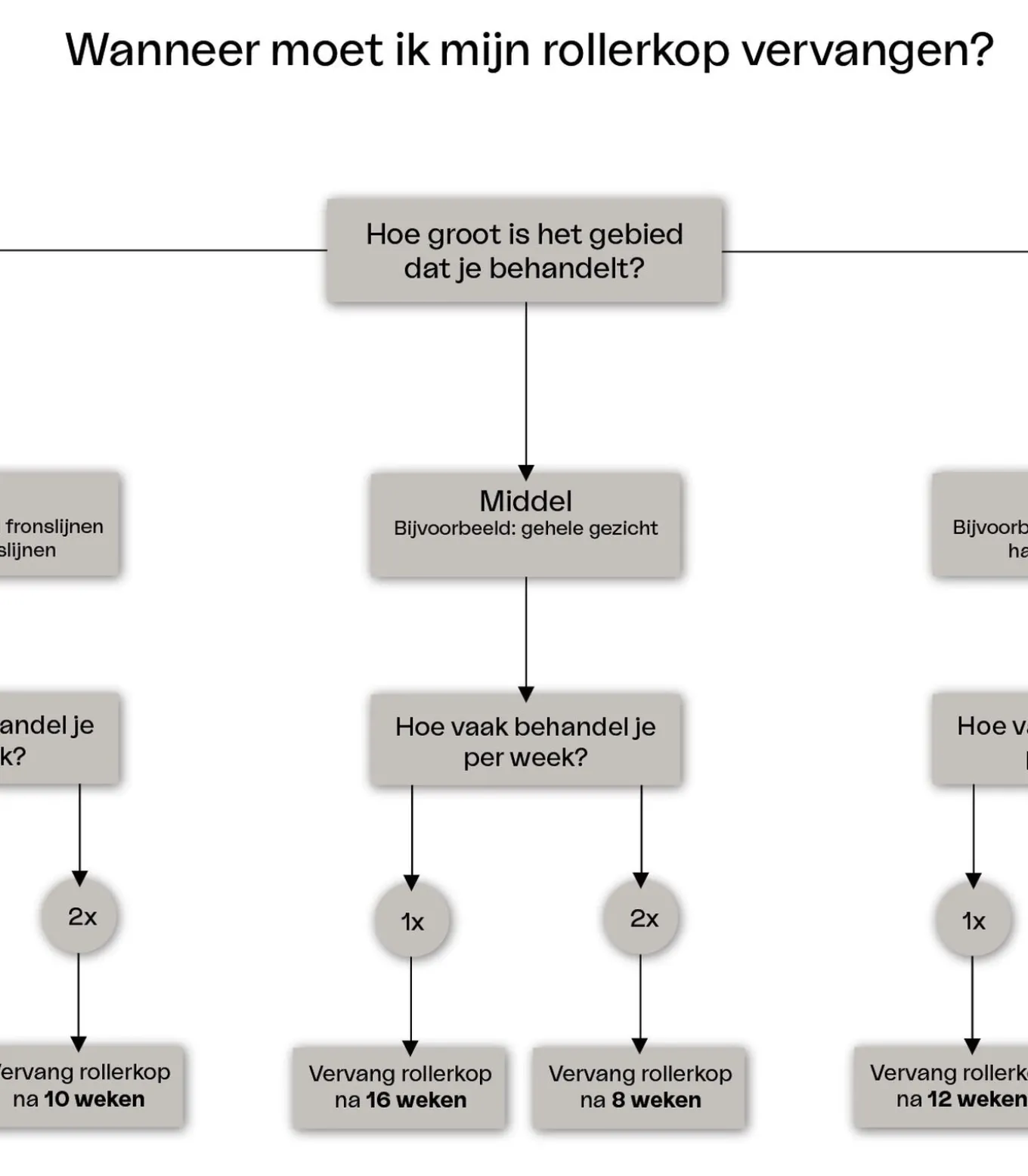 Wanneer je vaker dan één keer per week behandelt of meerdere lichaamsdelen tegelijk, is het verstandig om de rollerkop eerder te vervangen. Een tijdige vervanging is belangrijk, omdat de naaldjes na verloop van tijd hun scherpte verliezen en daardoor minder effectief worden.
