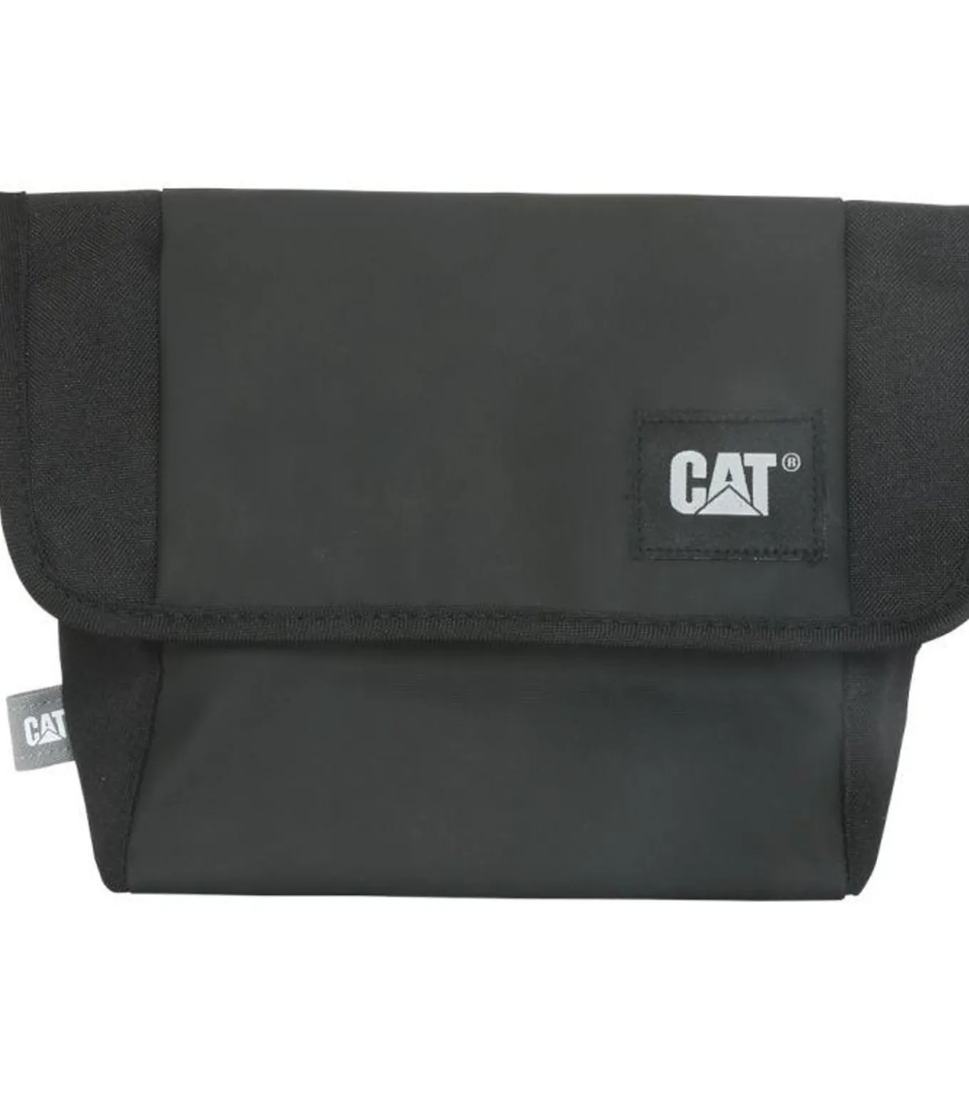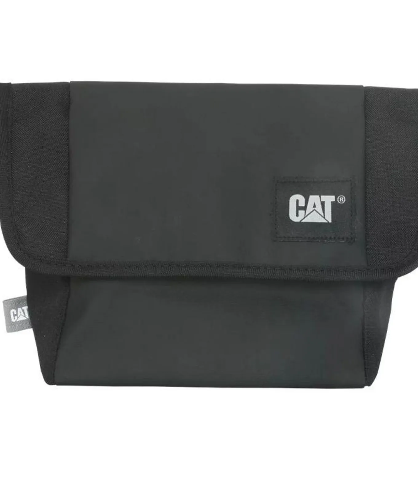 Caterpillar Detroit Zwarte Tas van polyester, meerdere binnenzakken, met één hoofdcompartiment. De zak heeft een verstelbare schouderriem en een versterkte basis. Het ontwerp bevat het Caterpillar logo en Flard–ontwerp. De sluiting kan worden gesloten met een klep, haak of lus.