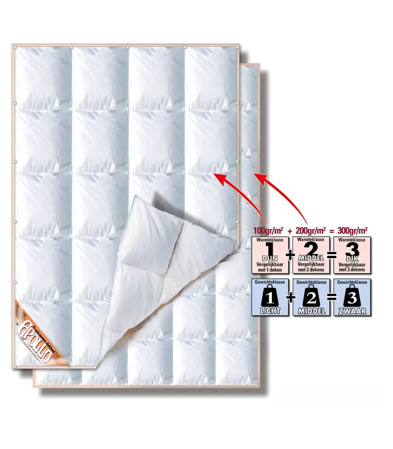 Fantastisch 4–seizoenen dekbed voor wie kiest voor het fantatische comfort van een origineel voldonzen dekbed is hier het aanbod van het jaar: APOLLO! Apollo is een subliem 4seizoenendekbed, voor aangepaste warmte in elk seizoen. Het hoogwaardige eenden–dons is heerlijk zacht, licht en soepel.