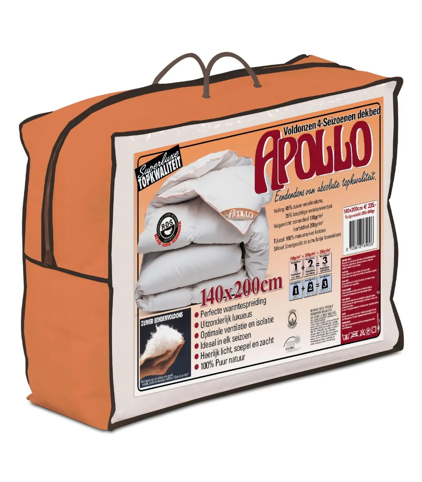 Het échte Apollo All Season donsdek, lekker vormend, absorberend, ventilerend, volumineus & héérlijk licht. Extra royaal gevuld met een melange van zuiver eendendons en krachtige eendenveren (Volumeaandeel dons gehalte is 65%, veren gehalte 35%).