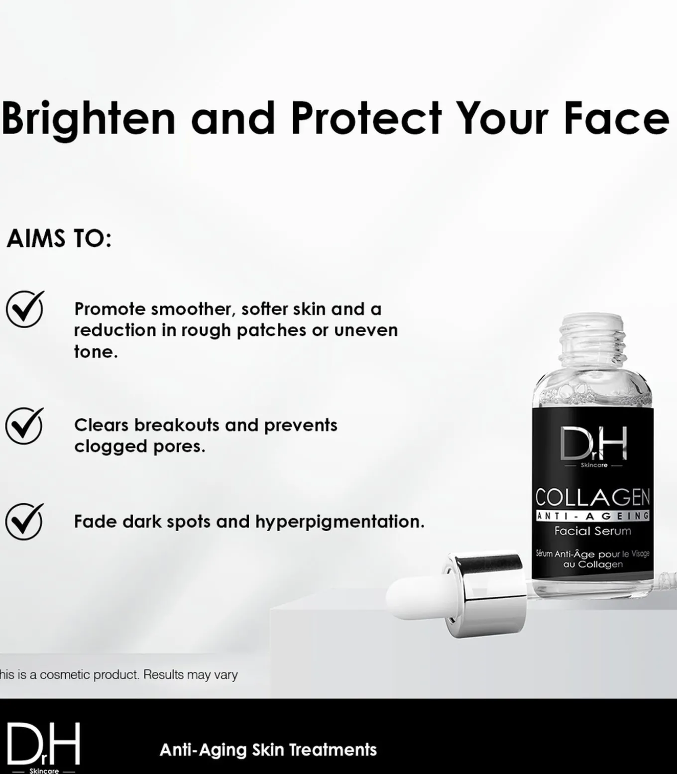 Dr H Anti–Ageing Collageen Gezichtsserum 30mlCollageen, Vitamine E, Aloë Vera. Hydrateert, verstevigt en beschermt de huid.