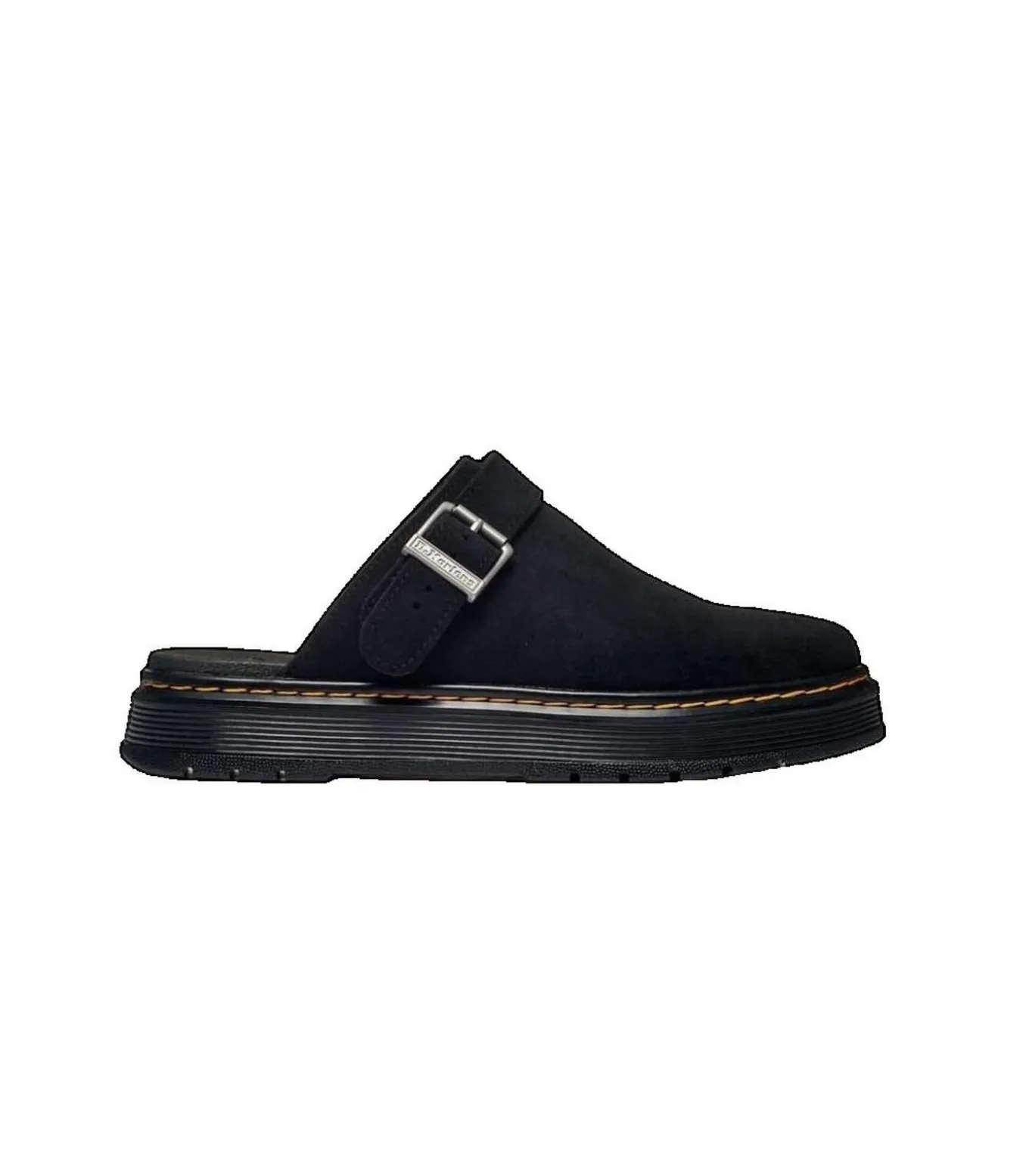 Ontdek de Brookline mules van Dr. Martens, een perfecte mix tussen schoen en sandaal. Ontworpen voor de zomer met een afneembare band die achter de hiel of rond de enkel gedragen kan worden voor gemakkelijk aan– en uittrekken. Met een lichte zool en iconische gele stiksels, zijn deze zwarte suède mules ideaal voor lifestyle gebruik. De voering van textiel, leer en polyurethaan zorgt voor comfort en duurzaamheid. Ook perfect voor de herfst, combineren ze stijl en functionaliteit.
