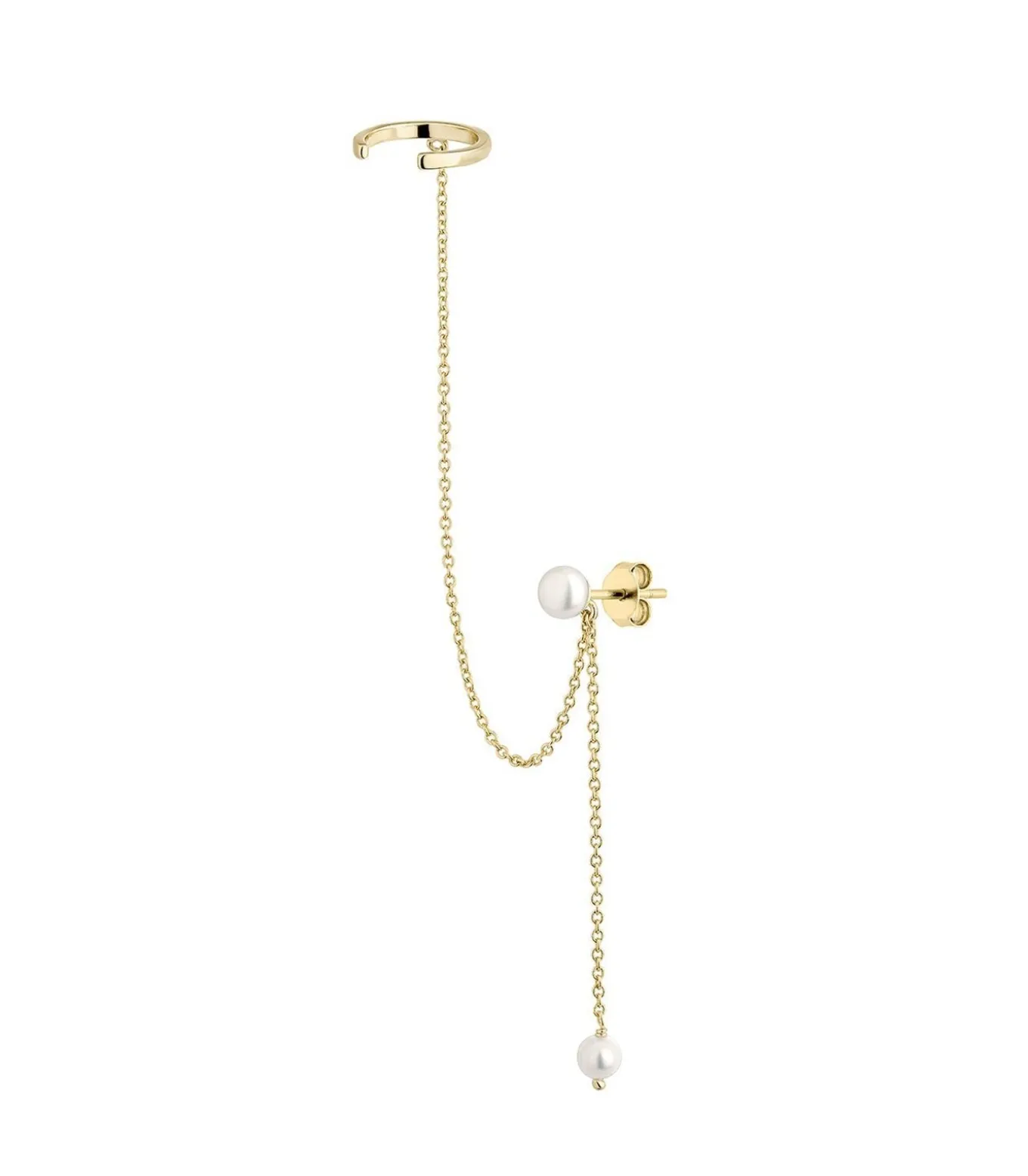 DETAILSHuahine oorbel met meerdere piercings gemaakt van 925 sterling zilver en 18k geelgoud plating. De oorbel bestaat uit een natuurlijke parel piercing waaraan twee kettinkjes hangen, één kettinkje met een parel moeren topje en het tweede kettinkje is bevestigd aan een effen earcuff.Materiaal: 925 Sterling zilver. Afwerking: 18k geelgoud verguld. Stenen: Natuurparel en witte zirkonia. Sluiting: Druk.Afmetingen: Kralen (diameter): 4mm; Ketting: 6,5mm; Oorhaak: 11mm.Wordt per stuk verkocht.