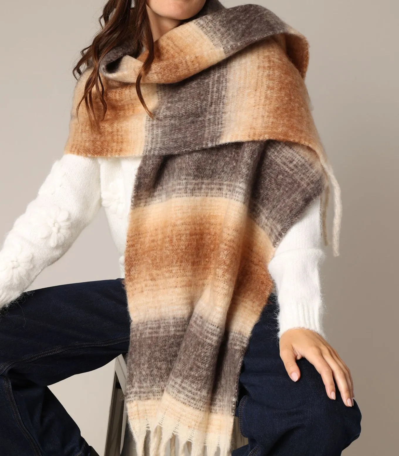 De ELSANA–sjaal valt op door zijn zachte, comfortabele stijl. Hij is gemaakt van een pluizige stof met woleffect en heeft een groot ruitpatroon dat is verwerkt in een elegant kleurverloop. Dankzij de losse pasvorm kun je hem comfortabel om je nek wikkelen of als sjaal over je schouders dragen. De lange franjes aan de uiteinden zorgen voor een bohemian, getextureerde touch. Een comfortabele en trendy stijl, perfect voor koele dagen.