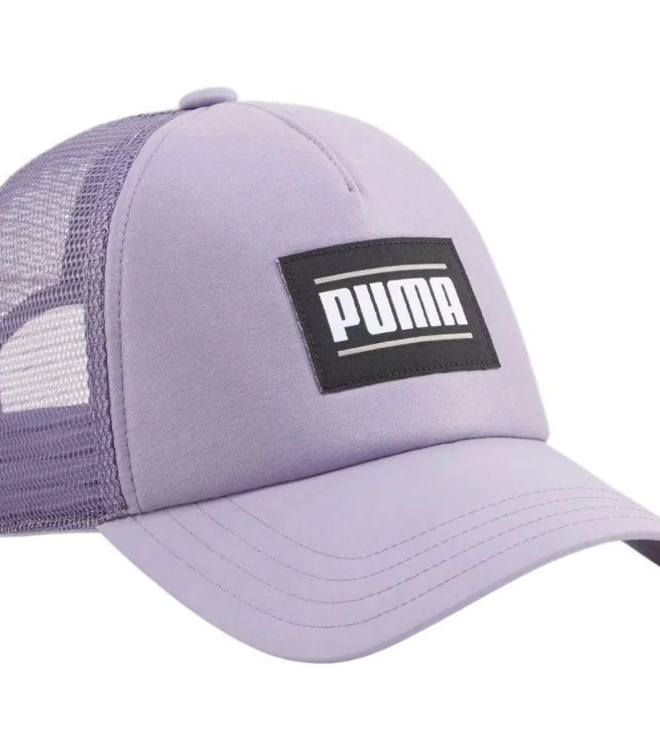 Puma ESS – Kap in violet is gemaakt van 100% polyester en telt een breedte van 60 cm. Het ontwerp draagt het bekende logo van de merk. De kap heeft vier rijen stiksels, een knoop boven aan het hoofd, een gekromde spoor en gaskrullen. Verder is er een vizier bij. De kap kan verstelbaar worden afgesloten met een kliksluiting. (Translation: Puma ESS – Cap in violet is made of 100% polyester and has a width of 60 cm. The design features the well–known logo of the brand. The cap includes four rows of stitching, a knot at the top, a curved peak, gasket panels, and a visor. Additionally, there is a vizier. The cap can be adjusted with a click closing mechanism.)