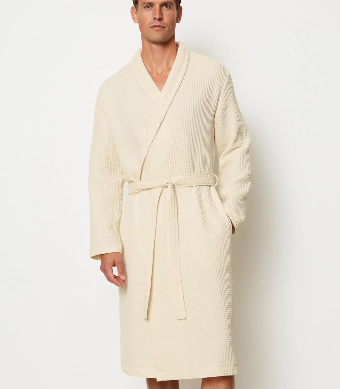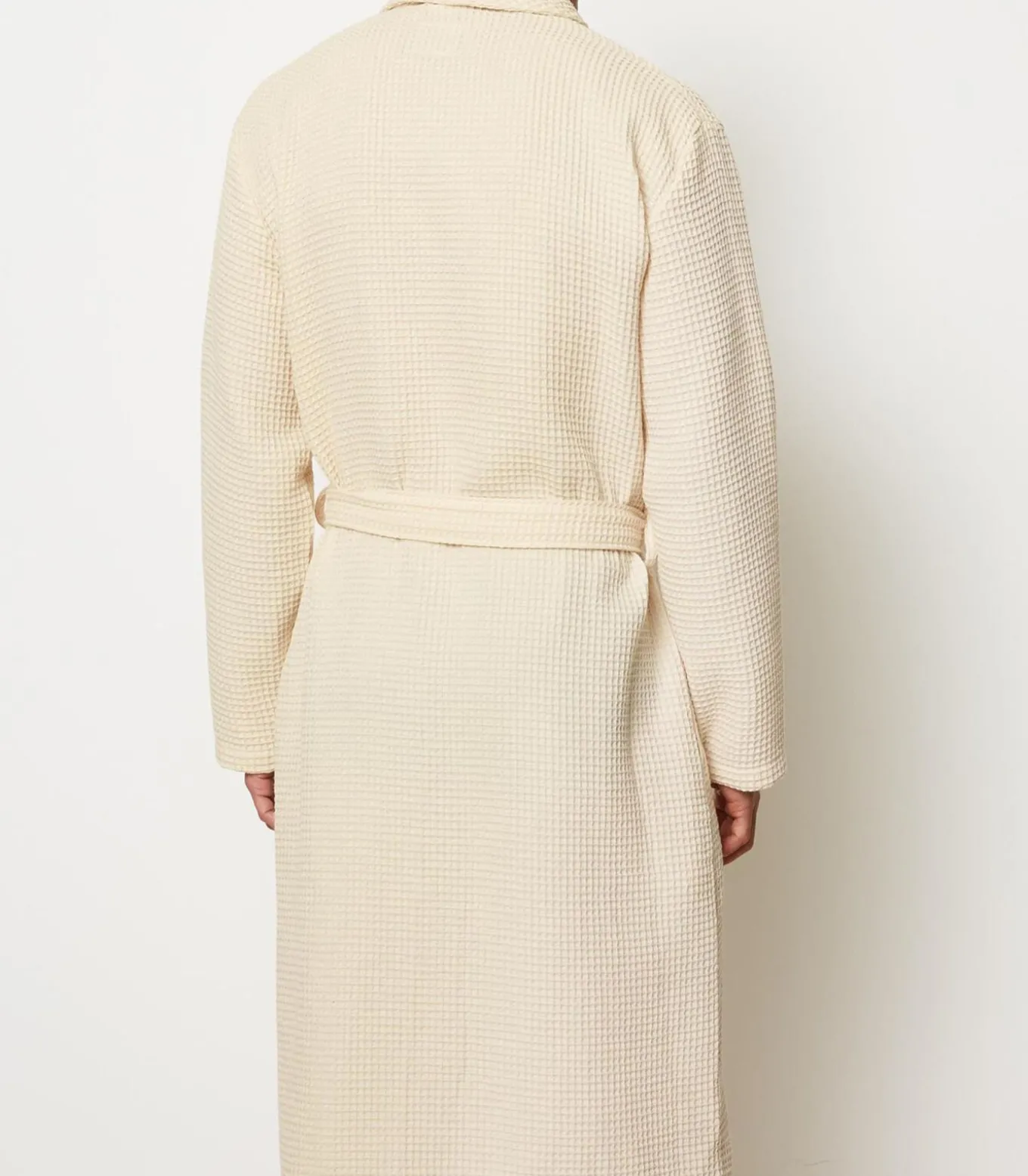 Contemporary Comfortable. Lichtgewicht badjas van GOTS–gecertificeerd biologisch katoen met een fijne wafelstructuur in tijdloze kleuren. Met een wijde kimonomouw voor vrouwen en een klassieke mouw voor mannen. Voor elk seizoen en elk moment.