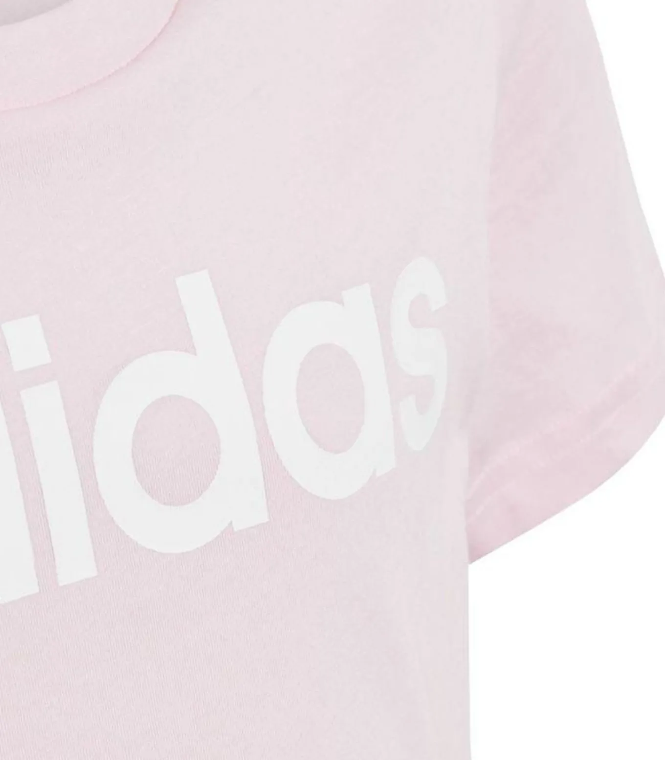 Adidas Essentials Linear T–Shirt, roze, 100% katoen. Deze T–shirt is gemaakt door merk Adidas en deel uit van hun Essentials Line. Het ontwerp van de T–shirt is eenvoudig met het logo van Adidas op de voorzijde. De hals is crew neck en de mouwen zijn kort. De T–shirt is vervaardigd met duurzaam stoftechnologie en geschikt voor slank personen. De maat is 34 in, ofwel 14 jaar.