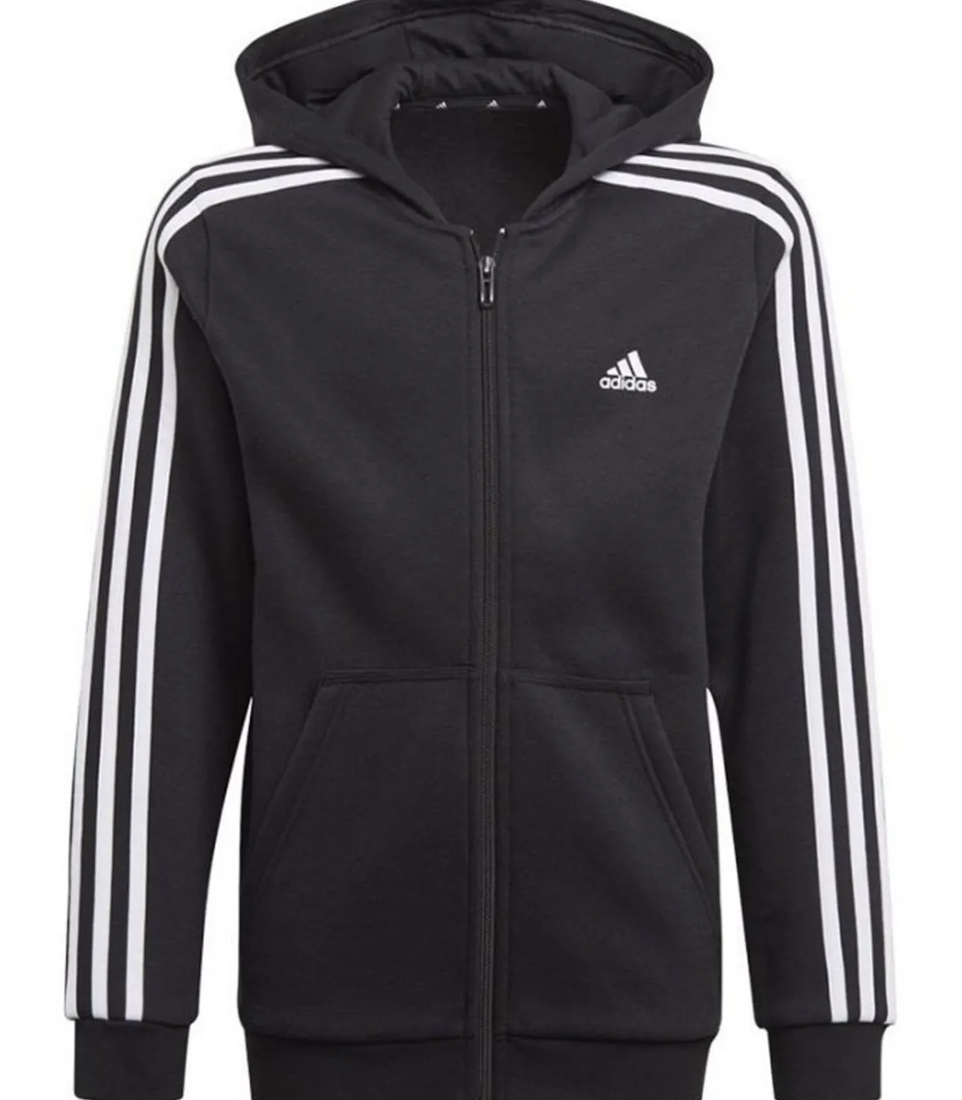 Adidas Essentials – Zwarte trui met kap en volledige ritssluiting gemaakt van 53% katoen, 36% gerecycled polyester en 11% viscose. Het stof bestaat uit vilt–like materiaal met zachte aanraking. Het ontwerp toont contrastende strepen en het logo. De zojuist gebonden kraag en mouwen hebben een kapiteinshalslijn. Deze trui is geschikt voor regelmatige gebruik en heeft één kangoeroezak. De volledige ritssluiting bevestigt de trui op elk niveau van 6 tot 14 jaar. De maten lopen van 24 inch op 6 jaar, 25 inch op 8 jaar, 28 inch op 10 jaar, 30,5 inch op 12 jaar en 34 inch op 14 jaar.