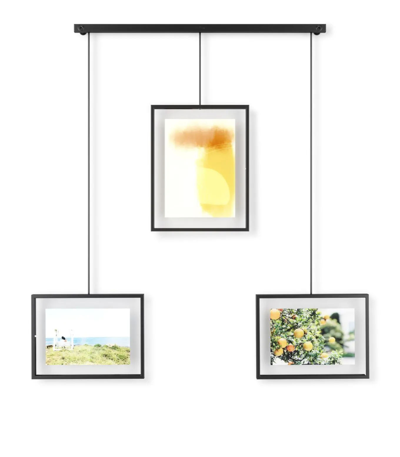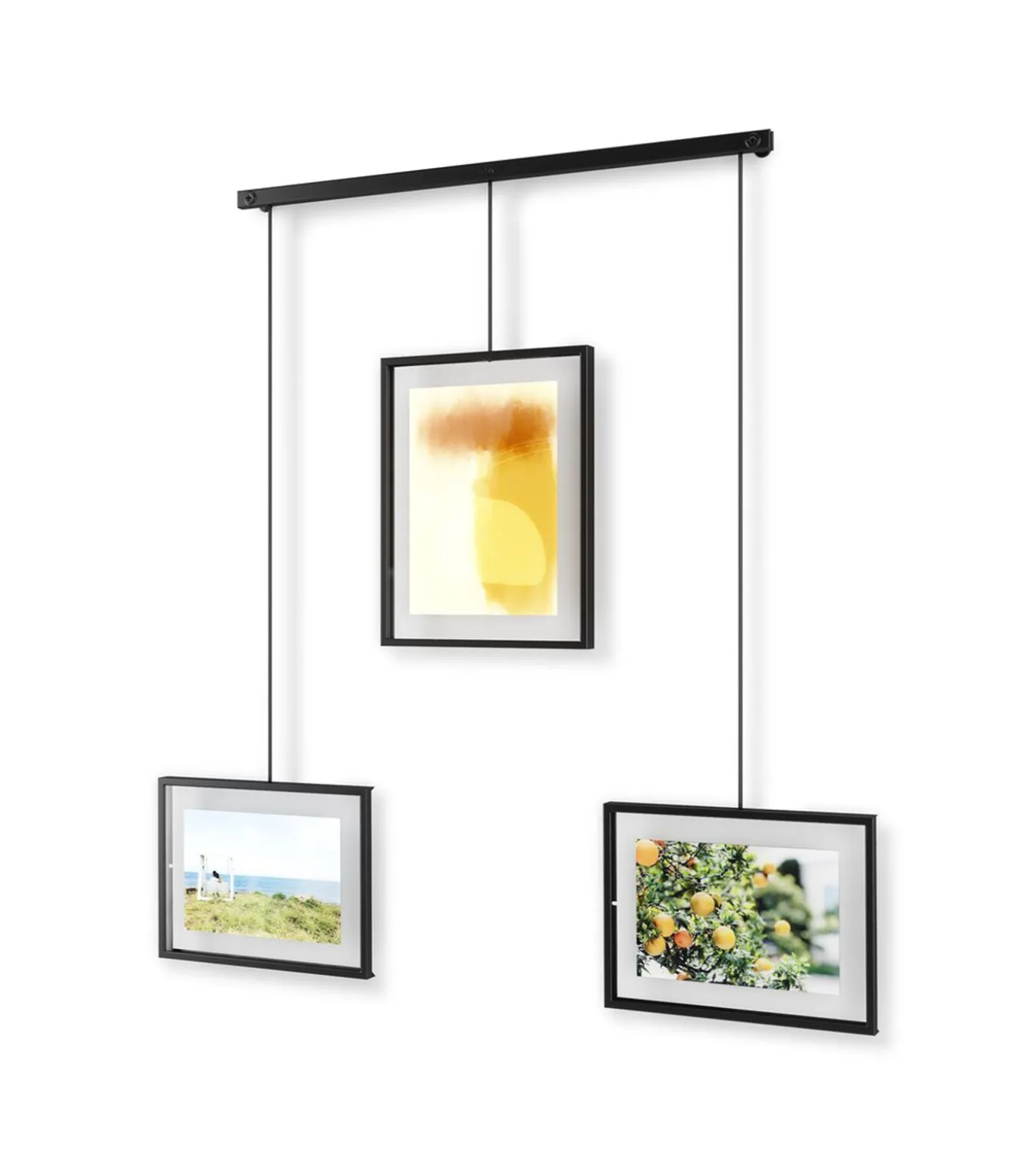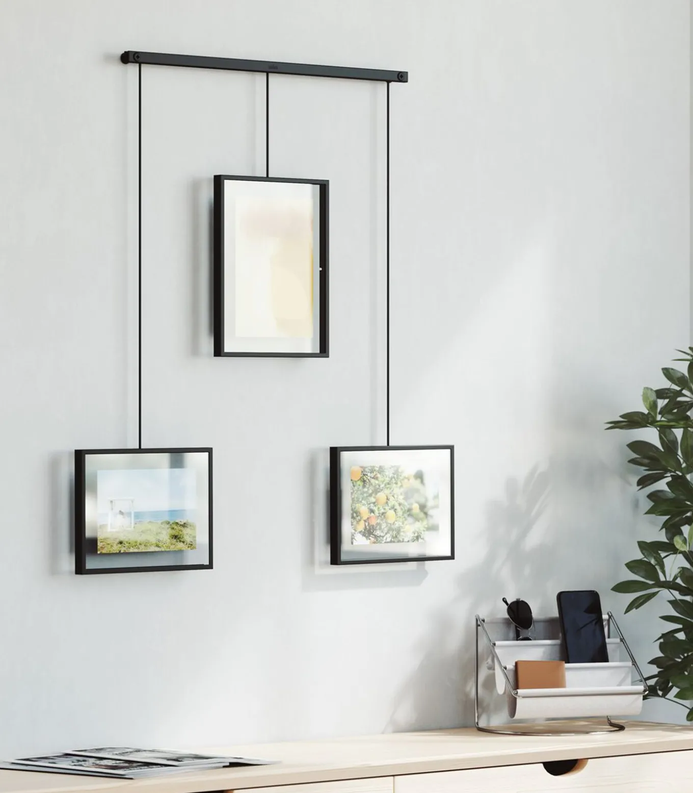 Exhibit bestaat uit een metalen staaf die aan de muur wordt gemonteerd, waaraan dan met clips en beugels drie fotolijsten worden opgehangen. Dat betekent minder boren, en dus minder schade aan de muur. De beugels met de fotolijsten hangen aan de staaf en kunnen helemaal naar wens verschoven worden. Exhibit is erg flexibel en kan ook perfect schuin boven de trap worden opgehangen. Gebruik Exhibit om moderne accenten aan te brengen in je woonkamer, slaapkamer, hal, kantoor of studio. Geef je favoriete foto’s en kunstwerken het plekje dat ze verdienen. Exhibit is helemaal aanpasbaar aan je eigen ideeën. De fotolijsten kunnen langs de metalen staaf worden verschoven en worden gedraaid voor liggende en staande foto’s. Exhibit wordt geleverd met twee lijsten van 10 x 15 cm en een van 13 x 18 cm voor al je favoriete foto’s, kunstwerken, illustraties en meer. Exhibit past naadloos in verschillende woonstijlen en maakt het makkelijk om foto’s en kunstwerken te vervangen en zo de kamer een heel nieuwe look te bezorgen. Europees ontwerpnummer 008159107–0001.