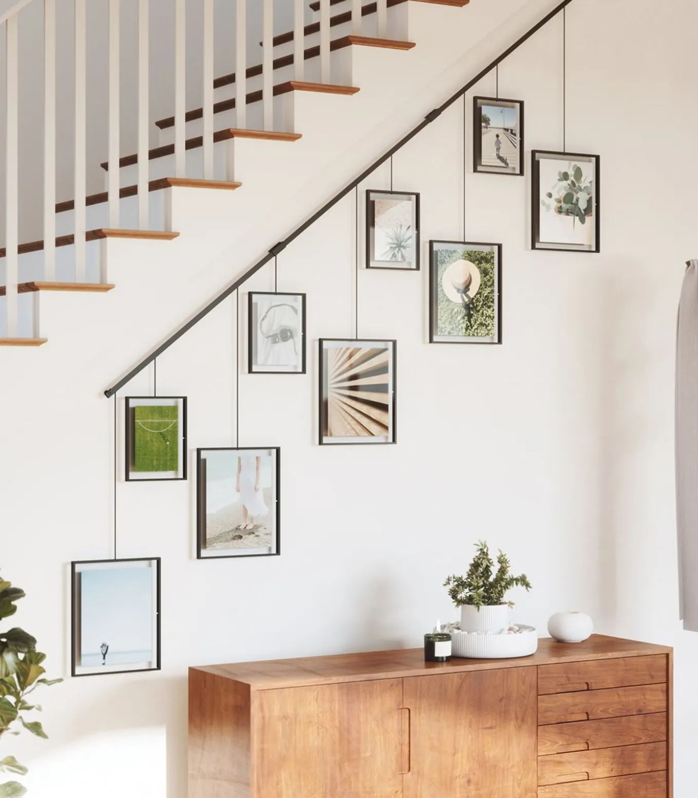 Exhibit bestaat uit een metalen staaf die aan de muur wordt gemonteerd, waaraan dan met clips en beugels negen fotolijsten worden opgehangen. Dat betekent minder boren, en dus minder schade aan de muur. De beugels met de fotolijsten hangen aan de staaf en kunnen helemaal naar wens verschoven worden. Exhibit is erg flexibel en kan ook perfect schuin boven de trap worden opgehangen. Gebruik Exhibit om moderne accenten aan te brengen in je woonkamer, slaapkamer, hal, kantoor of studio. Geef je favoriete foto’s en kunstwerken het plekje dat ze verdienen. Exhibit is helemaal aanpasbaar aan je eigen ideeën. De fotolijsten kunnen langs de metalen staaf worden verschoven en worden gedraaid voor liggende en staande foto’s. Exhibit wordt geleverd met vijf lijsten van 10 x 15 cm en vier van 13 x 18 cm voor al je favoriete foto’s, kunstwerken, illustraties en meer. Exhibit past naadloos in verschillende woonstijlen en maakt het makkelijk om foto’s en kunstwerken te vervangen en zo de kamer een heel nieuwe look te geven.