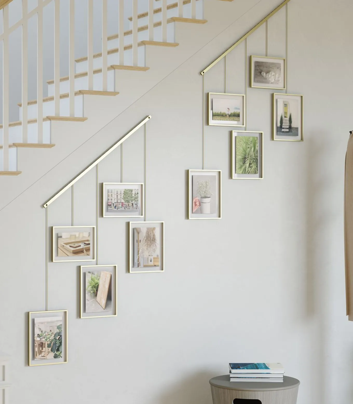 Exhibit bestaat uit een metalen staaf die aan de muur wordt gemonteerd, waaraan dan met clips en beugels vijf fotolijsten worden opgehangen. Dat betekent minder boren, en dus minder schade aan de muur. De beugels met de fotolijsten hangen aan de staaf en kunnen helemaal naar wens verschoven worden. Exhibit is erg flexibel en kan ook perfect schuin boven de trap worden opgehangen. Gebruik Exhibit om moderne accenten aan te brengen in je woonkamer, slaapkamer, hal, kantoor of studio. Geef je favoriete foto’s en kunstwerken het plekje dat ze verdienen. Exhibit is helemaal aanpasbaar aan je eigen ideeën. De fotolijsten kunnen langs de metalen staaf worden verschoven en worden gedraaid voor liggende en staande foto’s. Exhibit wordt geleverd met twee lijsten van 10 x 15 en drie van 13 x 18 cm voor al je favoriete foto’s, kunstwerken, illustraties en meer. Exhibit past naadloos in verschillende woonstijlen en maakt het makkelijk om foto’s en kunstwerken te vervangen en zo de kamer een heel nieuwe look te bezorgen. Europees ontwerpnummer 008159107–0001