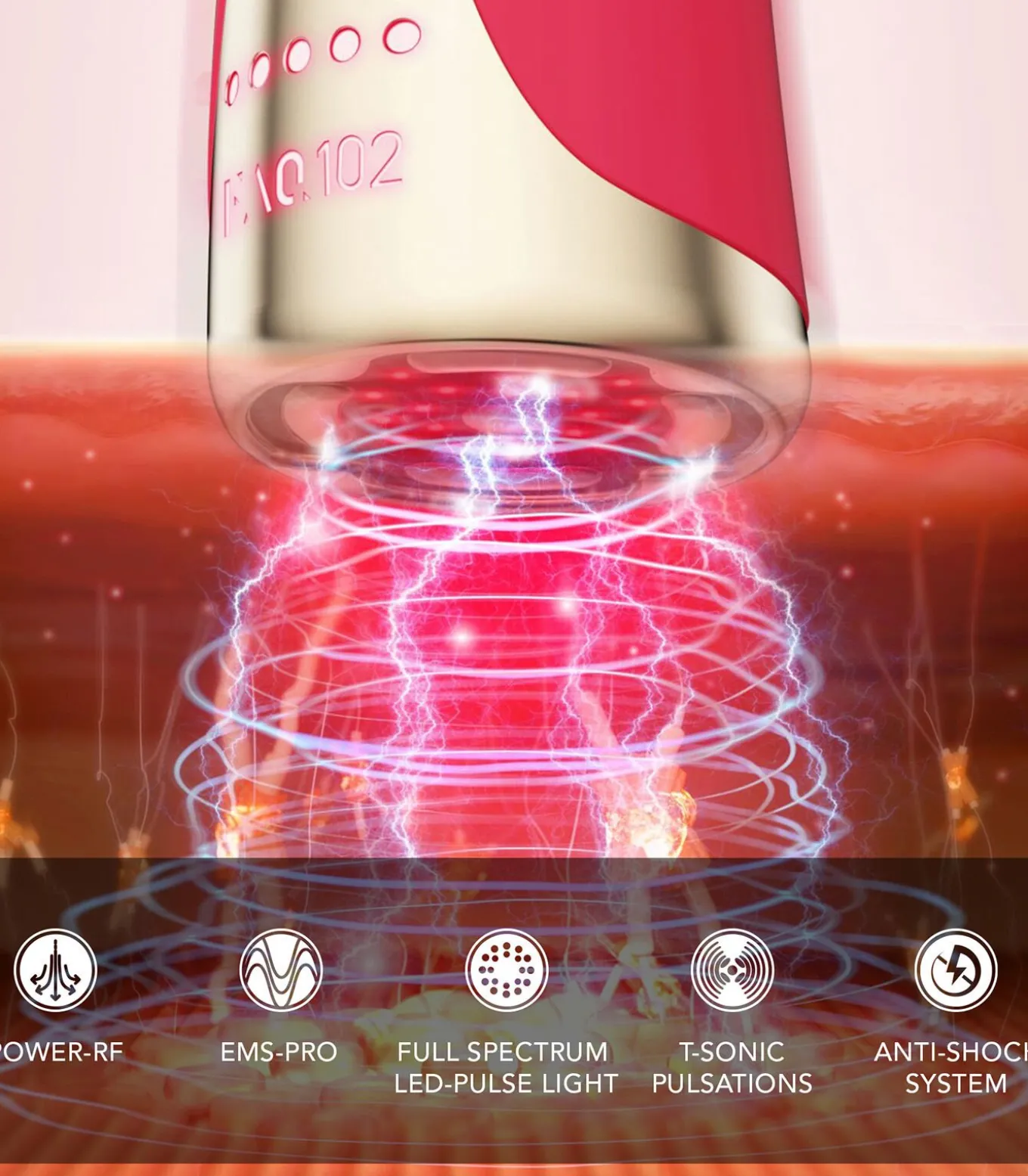 ZWITSERSE BEAUTY–TECH VOOR EEN VOLLEDIGE GEZICHTSTRANSFORMATIEMet trots presenteren wij FAQ™ 102: een verbluffend apparaat dat het beste van ’s werelds meest krachtige anti–aging technologieën samenbrengt in één apparaat voor persoonlijk gebruik. FAQ™ 102 gebruikt professionele anti–aging functies met professionele kracht en resultaten, zoals: Power–RF (verwarmde radiofrequentie golven), sterke Full–spectrum LED–pulse behandelingen en EMS–Pro (Electric Muscle Stimulation). Daaraan werd de iconische T–Sonic™ pulsatie technologie toegevoegd, voor een hoogwaardige anti–aging behandeling met professionele resultaten in één ultra–hygiënisch siliconen apparaat. Elektrische spierstimulatie (EMS) maakt gebruik van elektrische stromen met een laag voltage, die samen met een geleidende gel of serum (zoals FAQ™ P1 Manuka Honey Primer) moet worden gebruikt zodat je veilig gebruik en effectief kunt werken aan strakke gezichtscontouren, huidversteviging en verstrakken van verslapte huid. Tegelijkertijd zorgt ons Anti–Shock System™ voor het ultieme gebruikscomfort. De Power–RF van de FAQ™ 102 stimuleert de huid op optimaal niveau om de productie van nieuw collageen te stimuleren en fijne lijntjes van binnenuit te verminderen, terwijl de LED–lichttherapie onzuiverheden vermindert en het natuurlijk herstellende vermogen van de huid versterkt. Beauty is not always pain! Geen filters, geen fillers: gewoon FAQ™ 102!