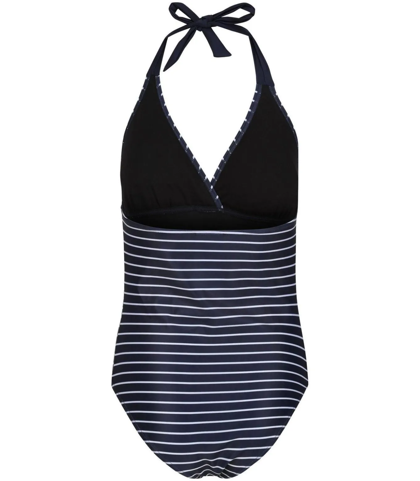 Regatta FLAVIA II is een eenheidspak uit één stuk met een marineblauwe kleur. Het materiaal bestaat uit elastiek, polyamide en polyester. De stof is seersucker en het ontwerp is gestreept. Het gewicht van de stof is 200gsm. Het pak heeft een halternek en kan worden aangezien via pull on. Het pak is niet bedraded, maar wel voorzien van gepantserde cups en buikband. Ook biedt het bescherming tegen UV–straling met een UPF klassering van 50+.