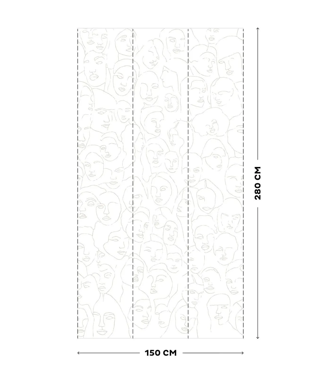 Het behang is voorzien van een patroon van abstracte lijntekeningen die de contouren van diverse vrouwengezichten vormen. De gracieuze lijnen vloeien moeiteloos en de zachte beige schetsen op de heldere witte achtergrond dragen bij aan een gevoel van sereniteit en warmte in elke ruimte.